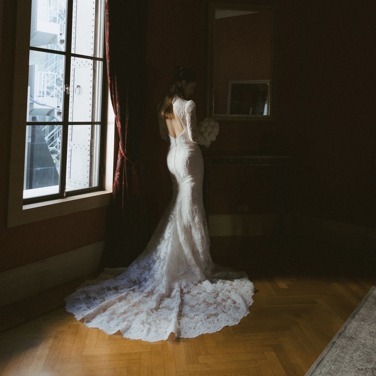 ウェディングドレスは、ロングスリーブでマーメイドラインかスレンダーラインが着たいと思っていて、探すのに苦労しましたが、このドレスに一目惚れでした。