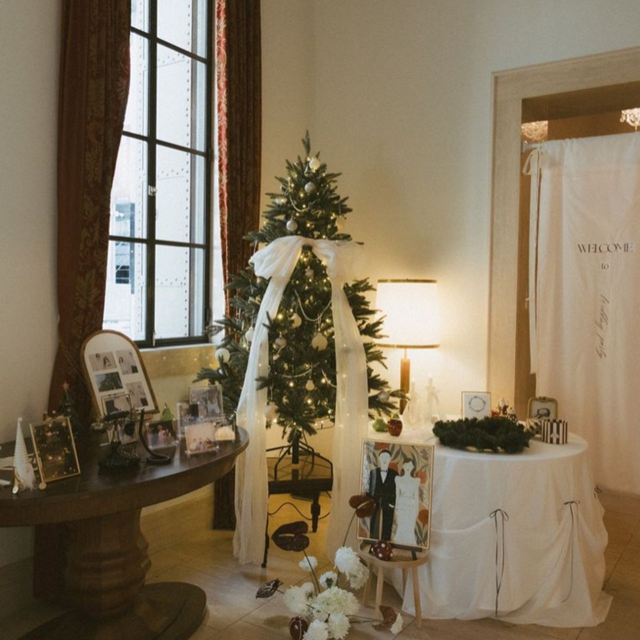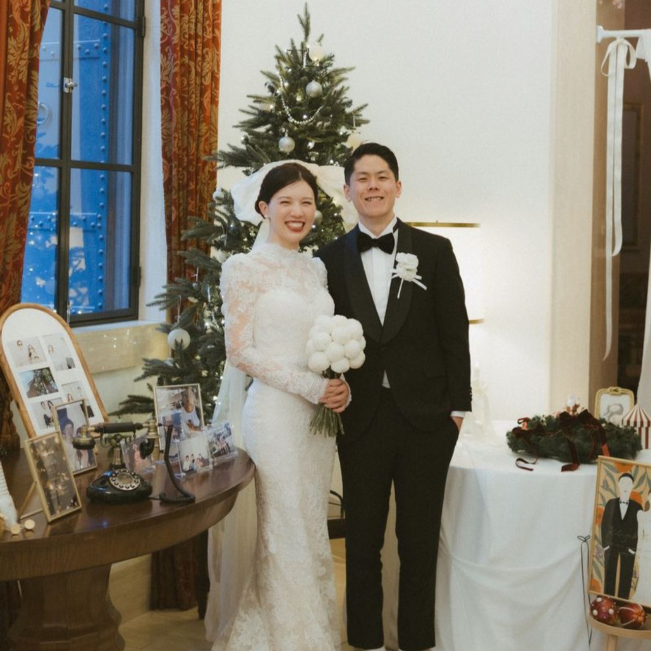 そのために、会場の装飾は、クリスマス感満載にしています。クリスマスカラーで装飾をして、ウェルカムスペースにはクリスマスツリーを置き、結婚証明書はクリスマスリースにしました。