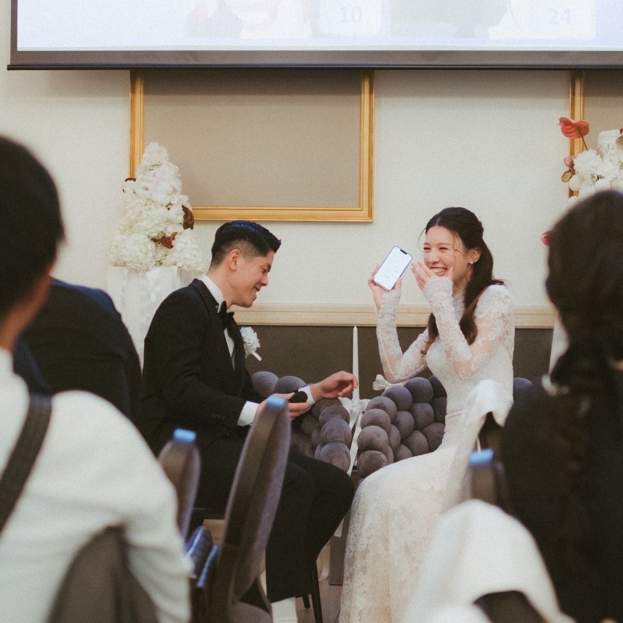ウェディングケーキの代わりに、みんなで盛り上がる早押し夫婦クイズをしました。テレビ番組のオールスター感謝祭のように、解答の正解率と早押し時間で競い合って、最終ランキング発表を行いました。