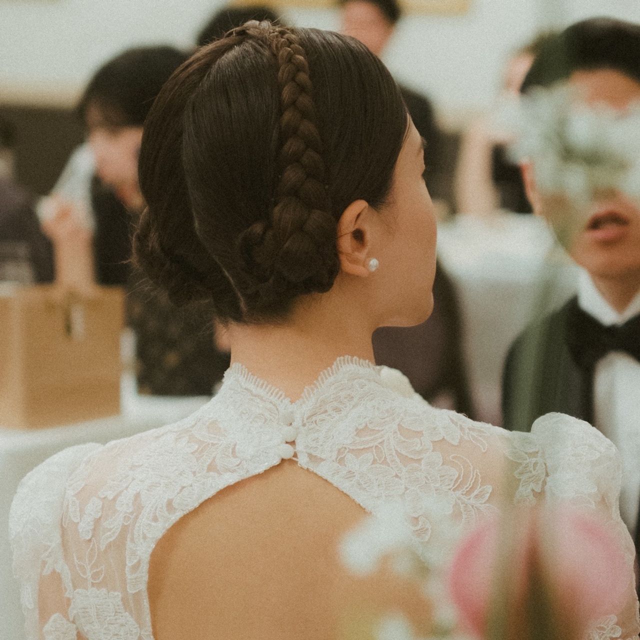 挙式では、レトロクラシカルな雰囲気にしたかったのと、ティアラをつけるのに抵抗があったことから、髪の毛をティアラっぽくしたいなと思っていました。Pinterest(ピンタレスト)で探して、理想に近い画像をヘアメイク担当の方に沢山見せ、いい感じにアレンジしてもらっています。