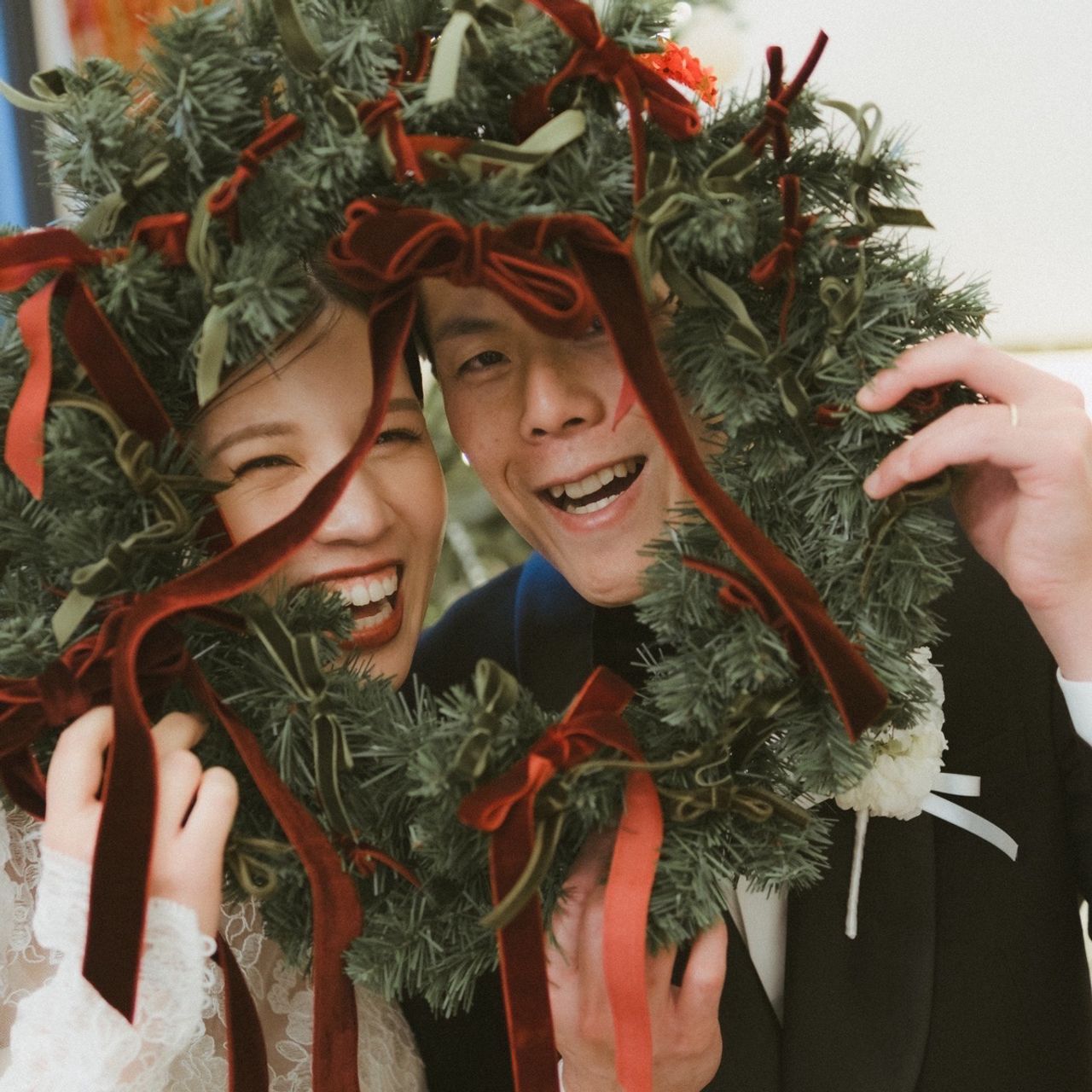 クリスマスリースは、ゲストの方にリボンをつけてもらう参加型の演出として取り入れています。クリスマス支度のようにワクワクしてもらえたらいいなと思い、プランナーさんの名提案を即採用したものです!