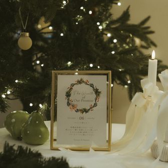 そのために、会場の装飾は、クリスマス感満載にしています。クリスマスカラーで装飾をして、ウェルカムスペースにはクリスマスツリーを置き、結婚証明書はクリスマスリースにしました。