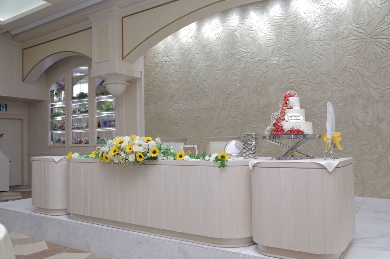 しかし、式を予定していた日を入籍日とし、さらに夏の記念日を増やしました!式当日は真冬でしたが、奇跡的に向日葵の生花が取り寄せられるということで、高砂装花も卓上装花も向日葵にしてもらいました。