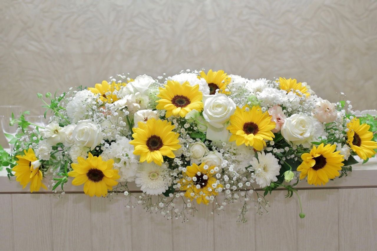 テーマカラーの白+黄色にしました。大好きな向日葵が目立つように、白のお花は小ぶりなものにしてもらいました。