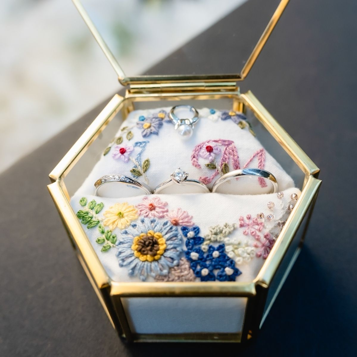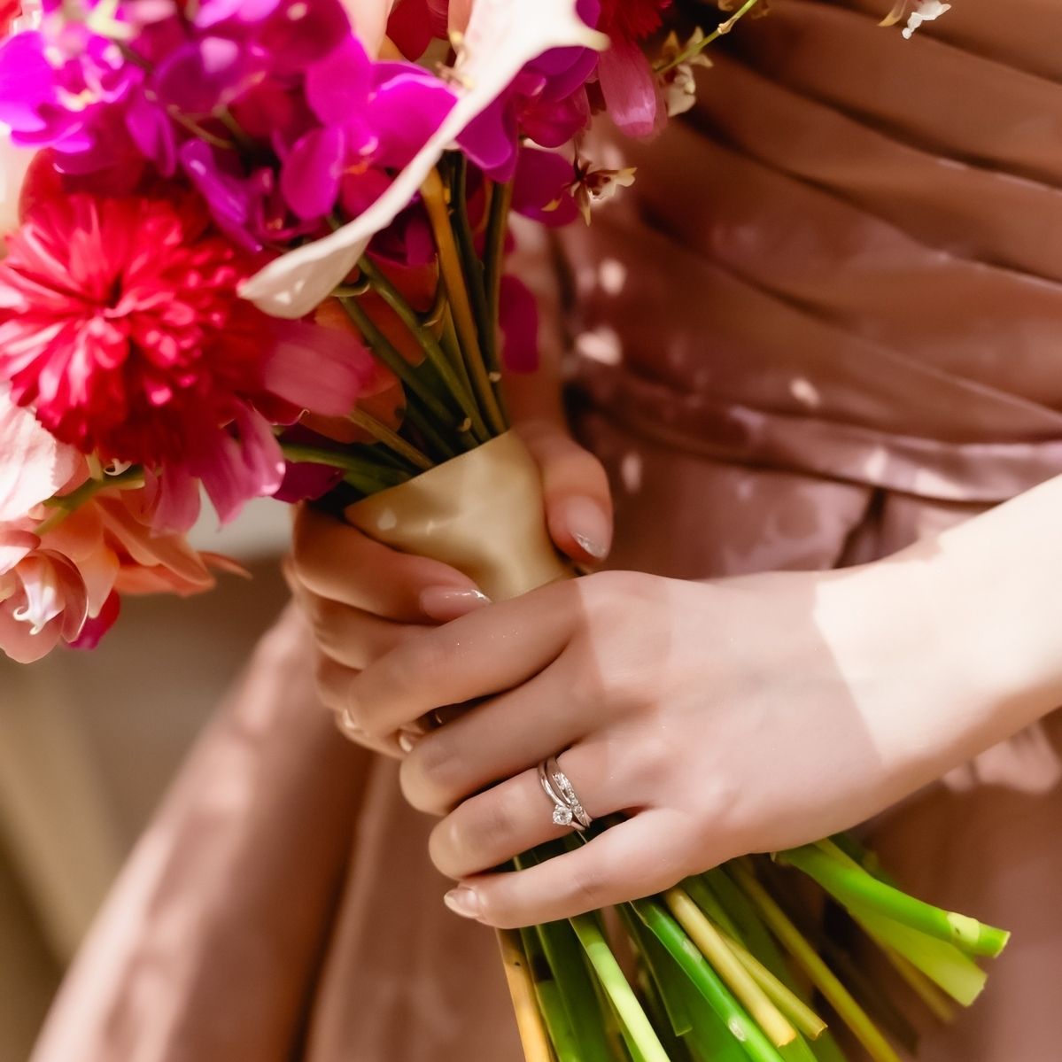 夫が一人で銀座のジュエリーショップを巡り、ダイヤモンドの質やカットなどの知識を付けた上で選んでくれました。