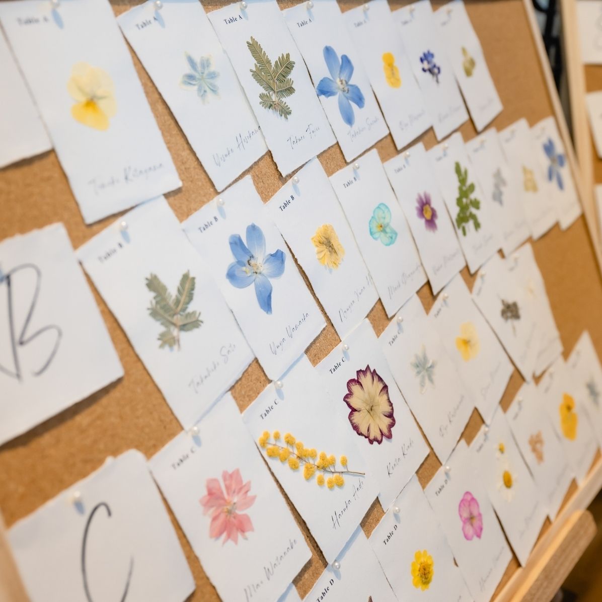また、エスコートカードはゲスト一人一人をイメージした押し花を使用して手作りをしたり、プロフィールブックには事前に募集したゲストからの質問に答えたり、待ち時間にも楽しんでもらえる工夫をしています。