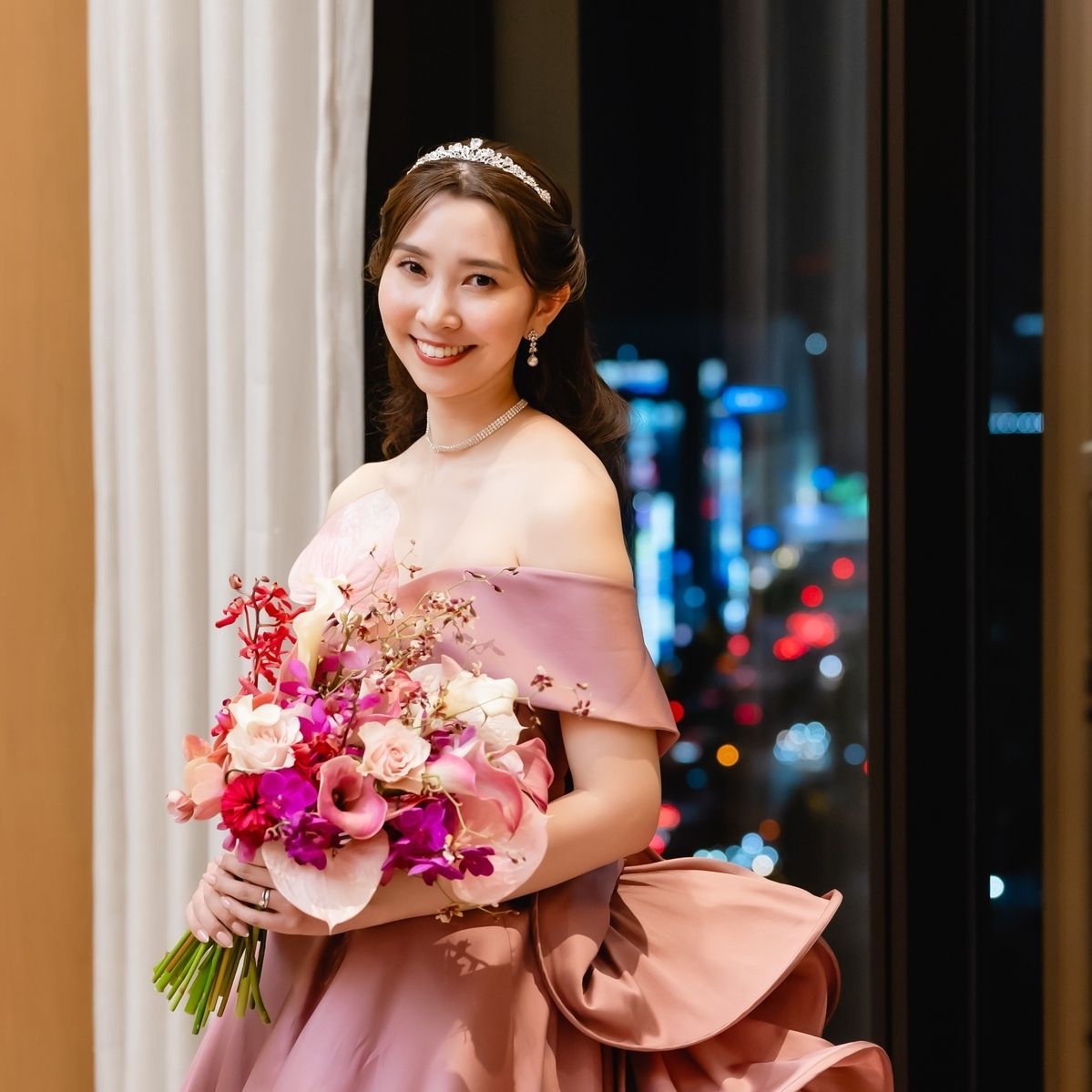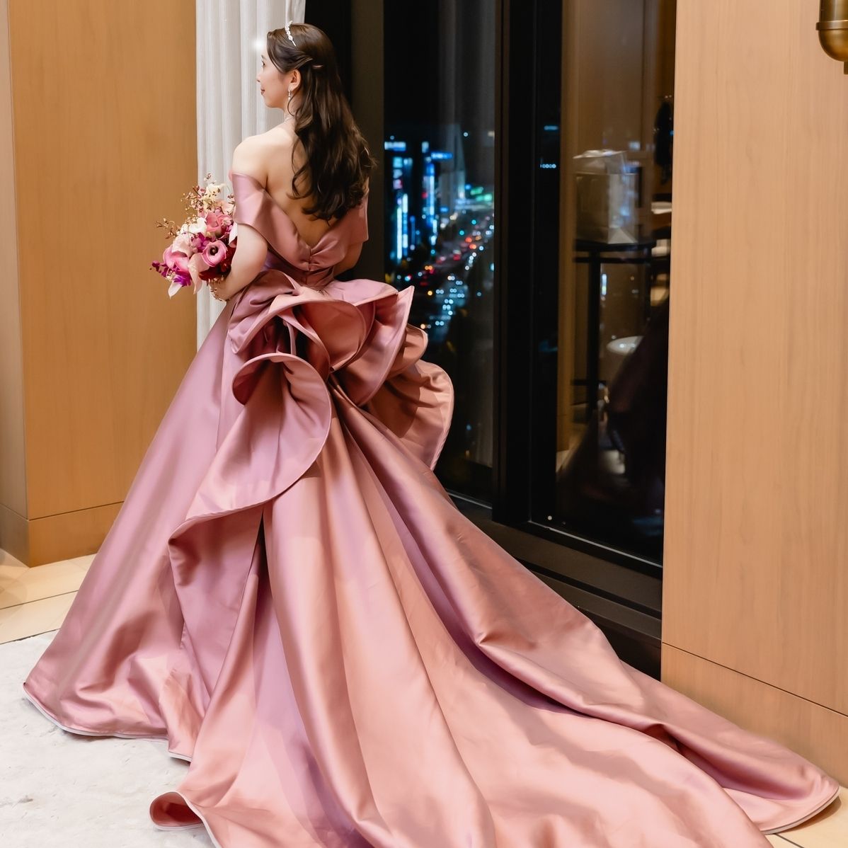 くすみピンクの色味が大人可愛く、ドレスの広がりや生地の張り感もゴージャスでお気に入りです。
