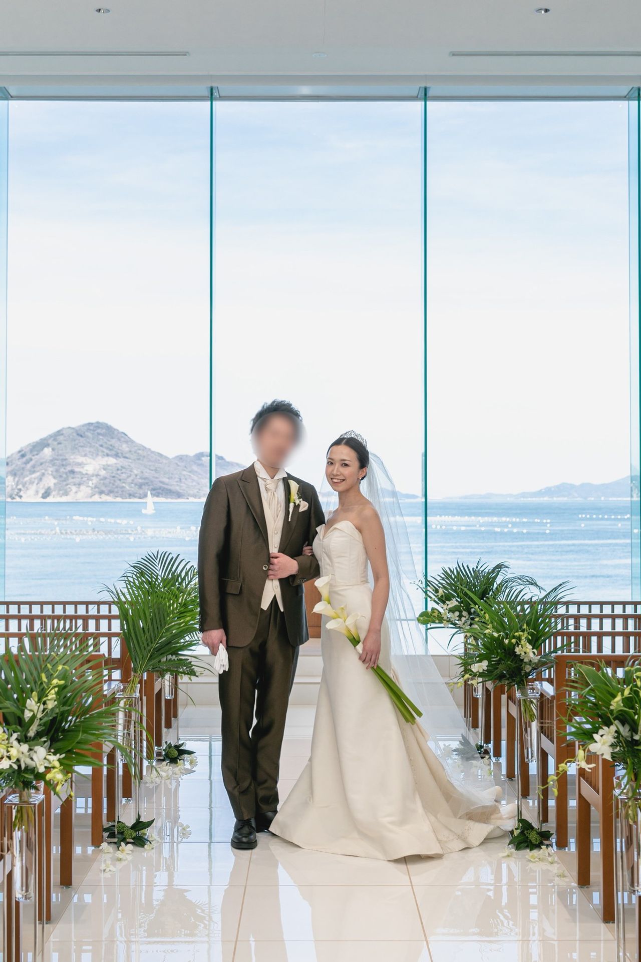ドアを開けた瞬間に、目の前に海が広がるチャペルです。海が見えるチャペルにすごく憧れていたので、即決でした。チャペルは真っ白で、青い海と空の背景がとても映えました。