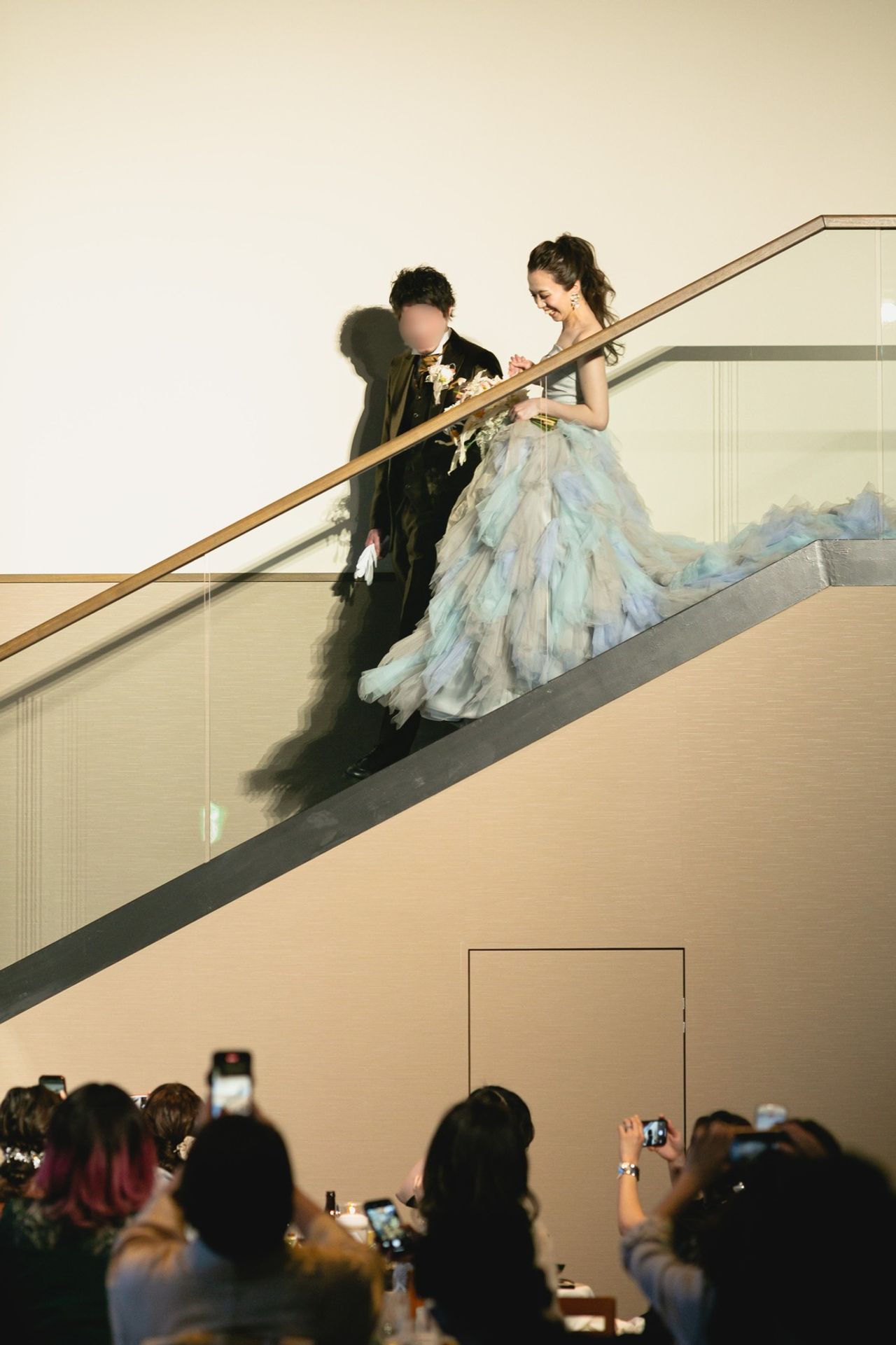 カラードレスはこの1着しか着ていません。そのくらい一目惚れしました。旦那さんも絶対これ!とイチオシでした。色の組み合わせがすごく好みだったのと、1着目とは違ってボリュームがあるので、階段から降りる再入場で映えるなぁ思いました。セパレートになっているので、歩きやすかったです。