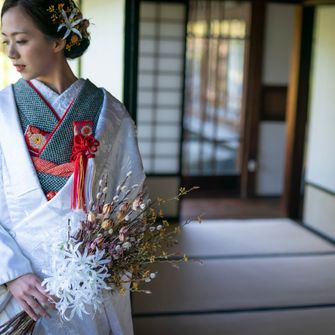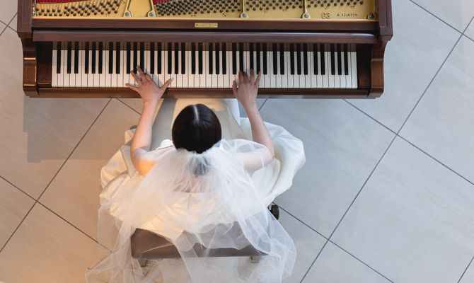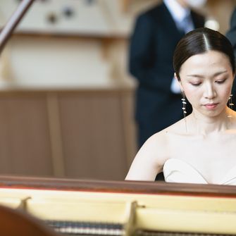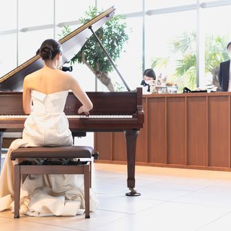 お出迎えスタイルで、『愛を込めて花束を』をピアノ演奏をしました。トーションフラワーにドライのブーケを用意していただき、それにちなんでこの曲を演奏しました。