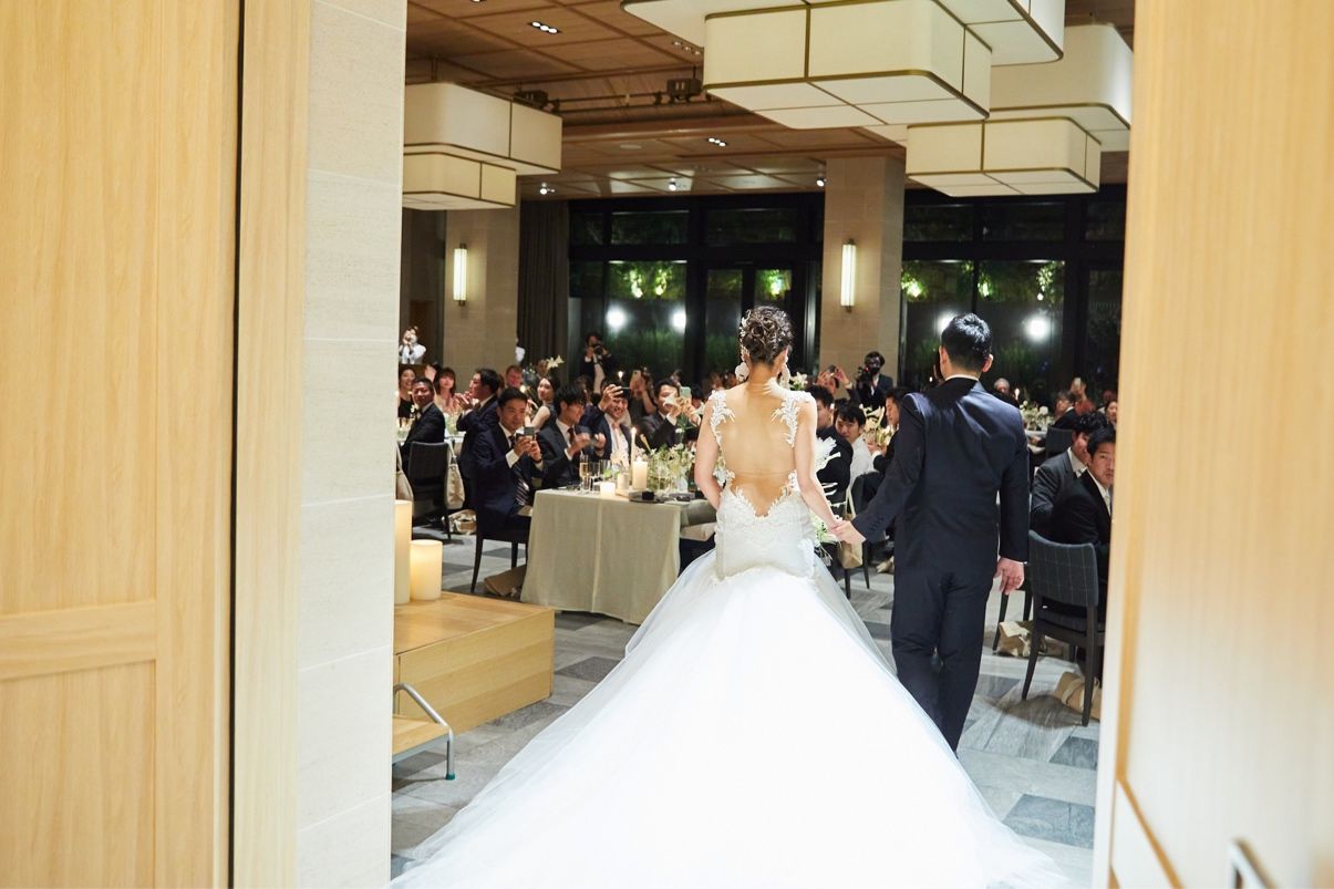 ONDENはTRUNK (HOTEL)の中でも一番広い会場で、ゆったり安心して参加してもらえました。横に広いので、後ろのゲストとの距離感は感じません。スクリーンも2面あるので、どの席からも映像がはっきり見えます。また、中庭からのお色直し入場はサプライズ感満載でした。
