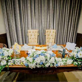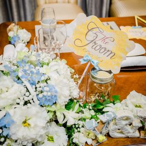 お色直しでは、ハーフアップにし、青のアジサイを付けてもらいました。