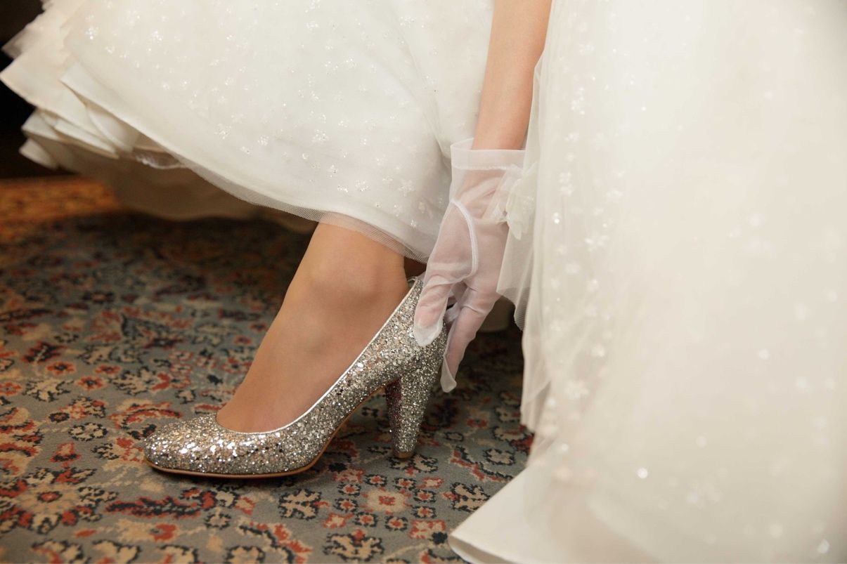 結婚式参列用に持っていたシルバーのグリッターパンプスを履きました。2着目のドレスはグリッターだと内側の生地を傷めるため、元々持っていたDIANAのウエッジソールのサンダルを使用しました。