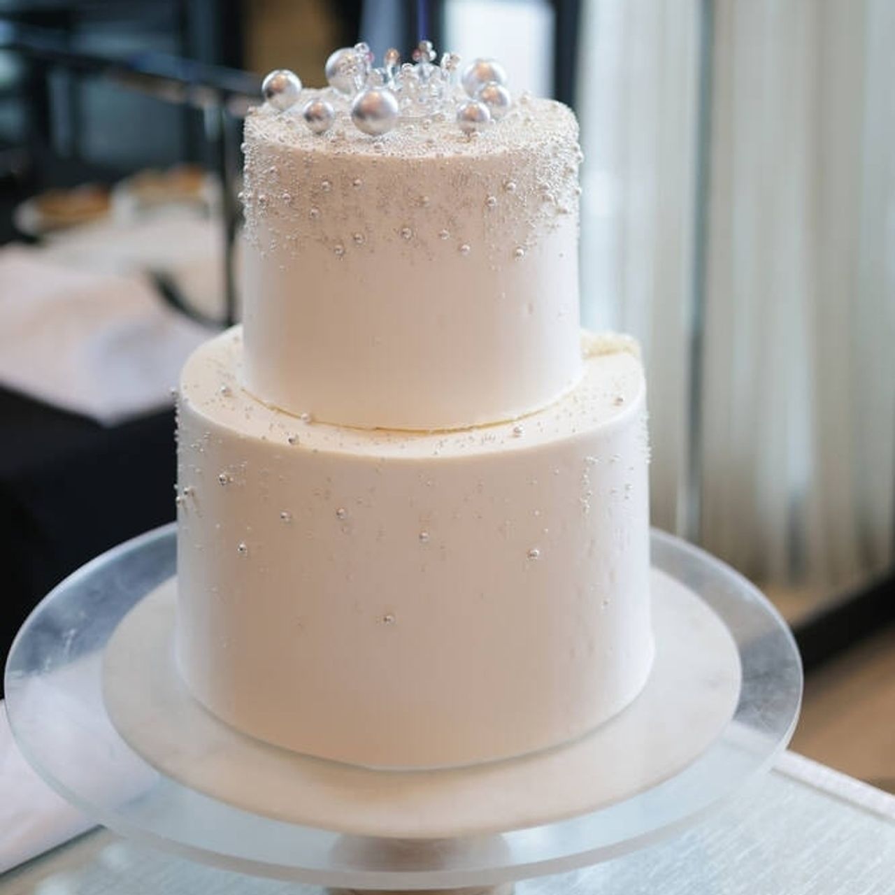 高さのあるウェディングケーキが旦那の1番譲れないポイントでした!パールのウェディングケーキにしてクラウンのトッパーもつけています‼︎