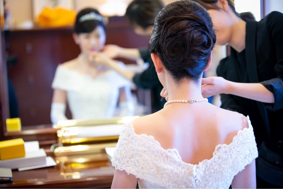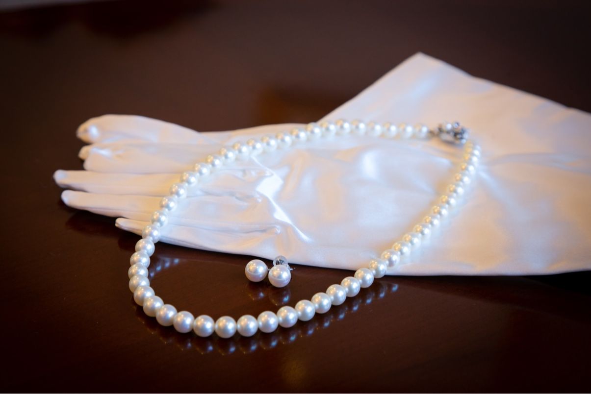 母から譲り受けたパールのネックレスとピアスを着用しました。