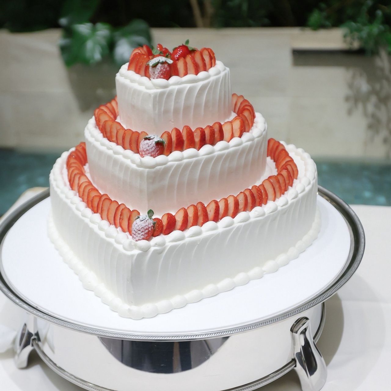 デザートビュッフェを用意したため、ウェディングケーキは予算内でありながら、豪華に見えるものを選びました。ハートが3段になったデザインで、とても可愛らしいケーキです。