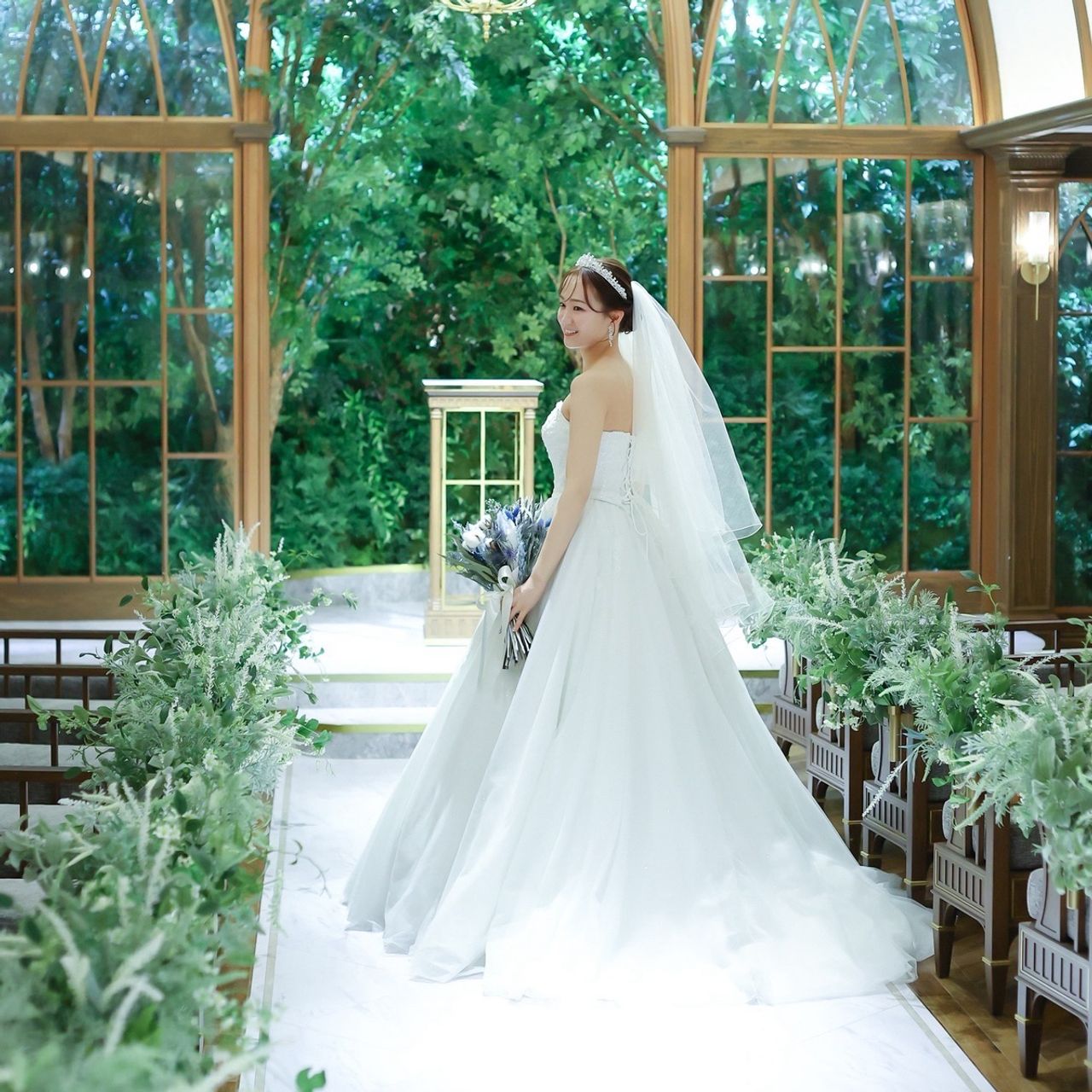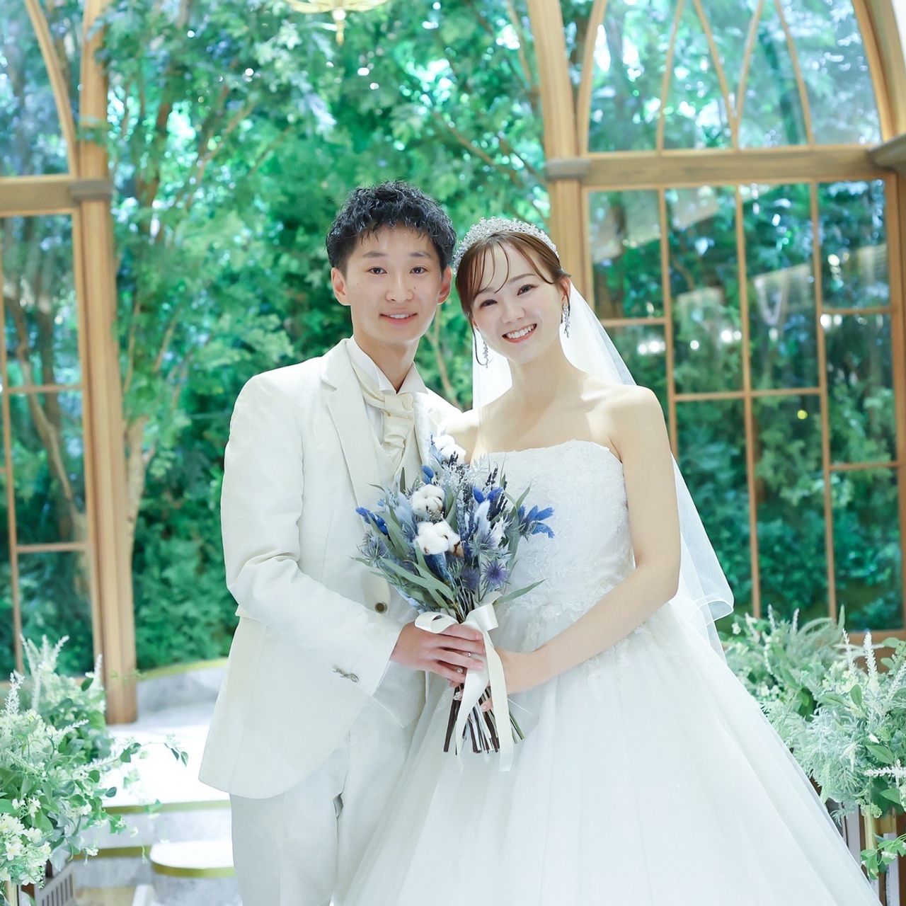 もともと観葉植物を育てていて植物が好きなこともあり、ガーデン側を高砂にしました。背景に広がる大きなガーデンがとても魅力的で、写真映えも抜群でした。