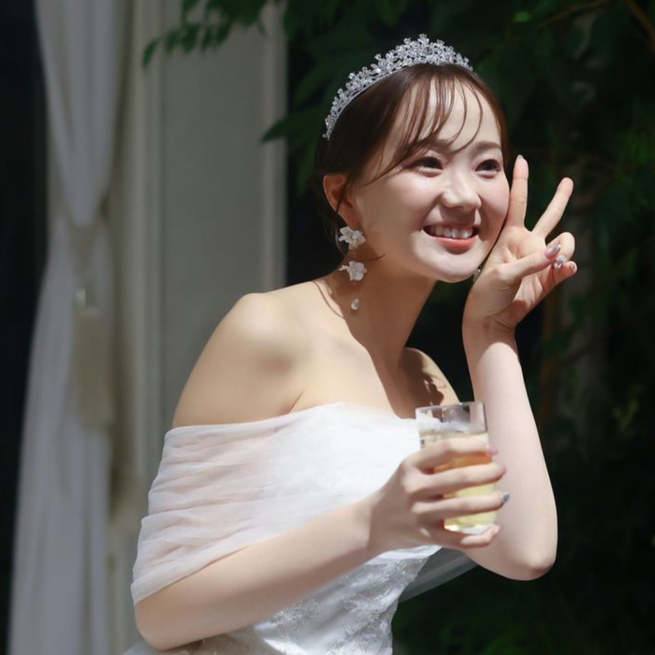 お色直しでは、ドレスに合わせてリボンモチーフのイヤリングをつけて、雰囲気を変えています。