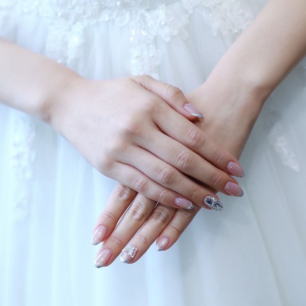 ベースはピンクマグネットにして、ガラスフレンチネイルです。ポイントでストーンをあしらいました。