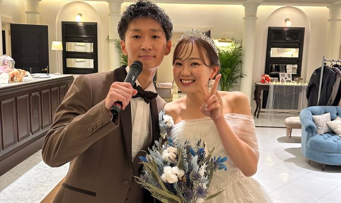 「みんなに楽しんでもらえる結婚式にしたい」という思いを大切に、大階段でのボトル乾杯を取り入れてゲストと直接お話しする時間を設けたり、余興を2つ用意したり、デザートビュッフェを行ったりと、楽しめる演出を一つひとつ考え工夫しました。