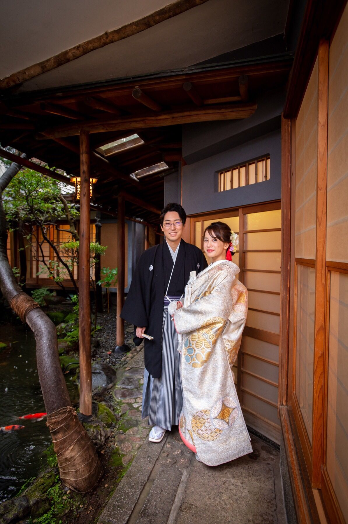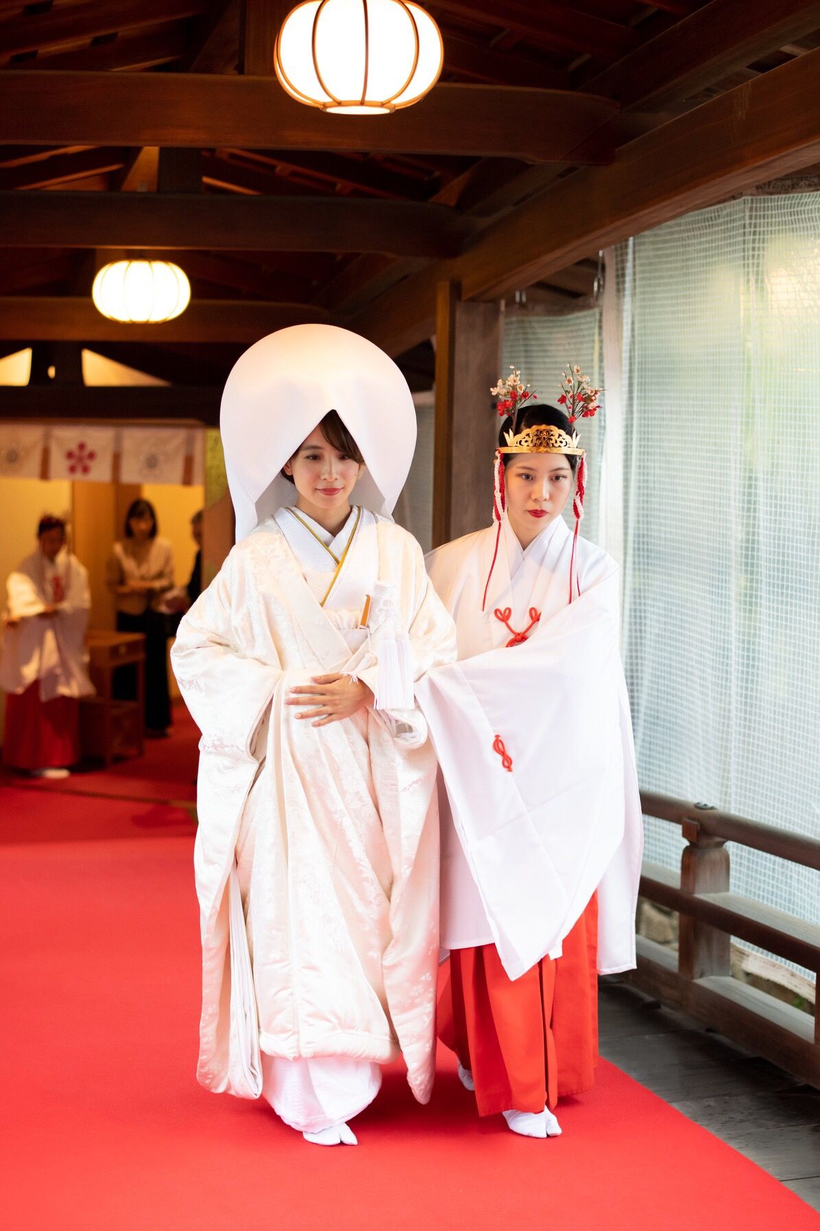 伝統的な神前式。神殿の天井には龍の絵が描かれており圧巻でした。大雨でも、憧れの太鼓橋で参進の儀が出来ました。