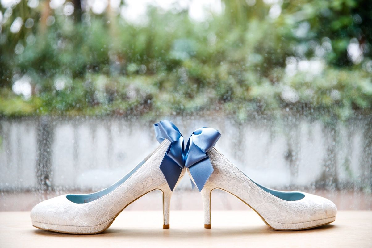 ウェディングドレス:靴とのリボンに合せてブルーを入れてもらいました。ホワイト×ブルー。 仕事柄ネイルはできないので、ネイルチップで。