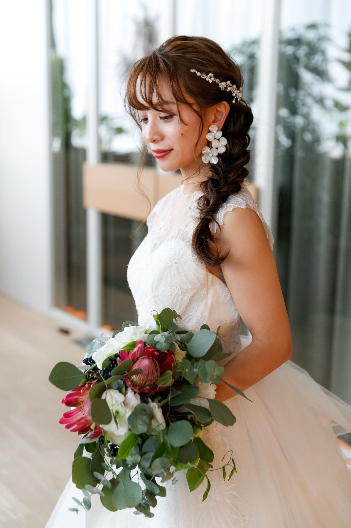 髪の毛はウェディングドレスに合せて明るめの色に。ハイライトをいれたのは、髪の動きがしっかり出て大正解でした。