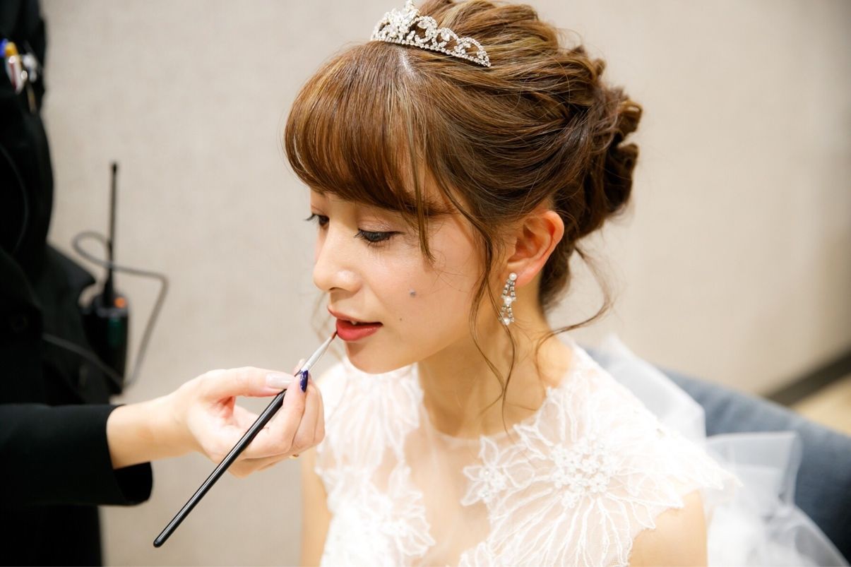 中座後の後半は細めのふわふわ編み下ろしで。前に流すスタイルで。メイクは華やかに。目元はラメ感アップ、リップも明るめの色に。