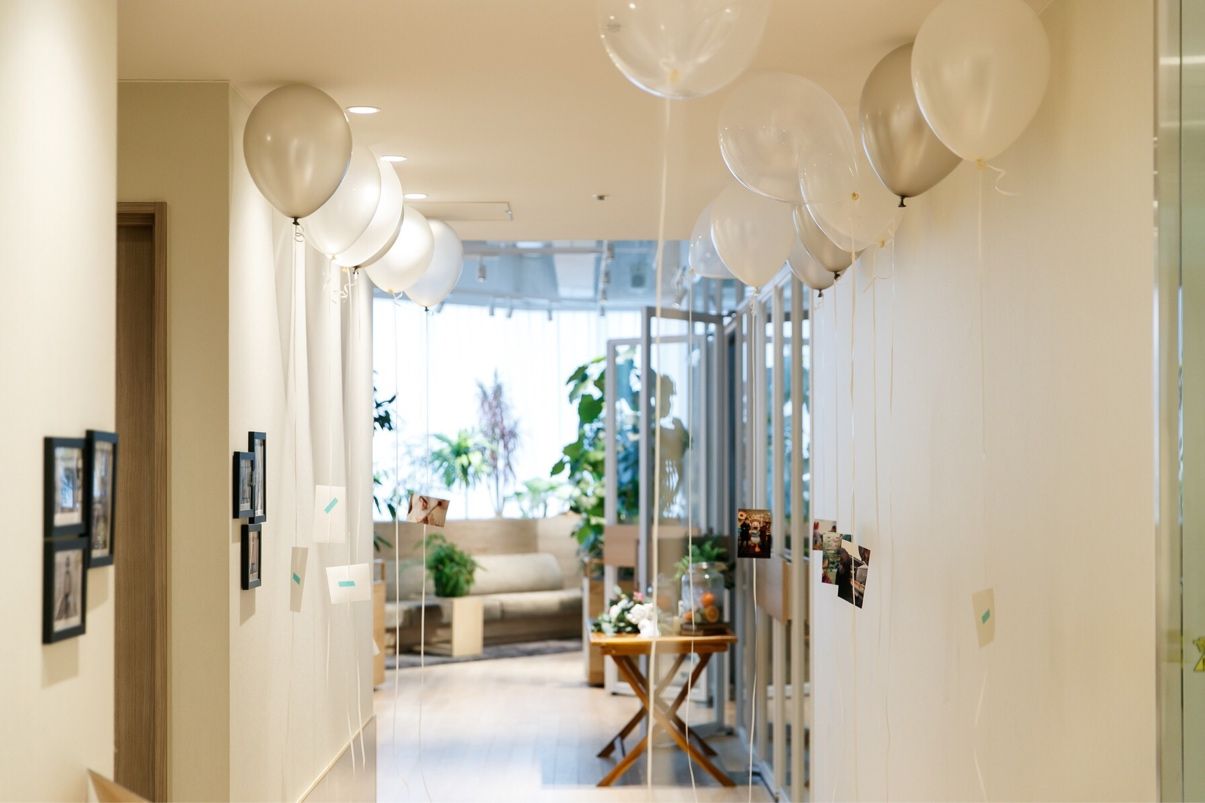 バルーンを使った演出: バルーンを使ってEVホールとホワイエの廊下の装飾。EVホールのバルーンを持って入場高砂後ろにそのまま装飾しました。バルーンはクリア、シルバー、ホワイトの3色はこだわり。