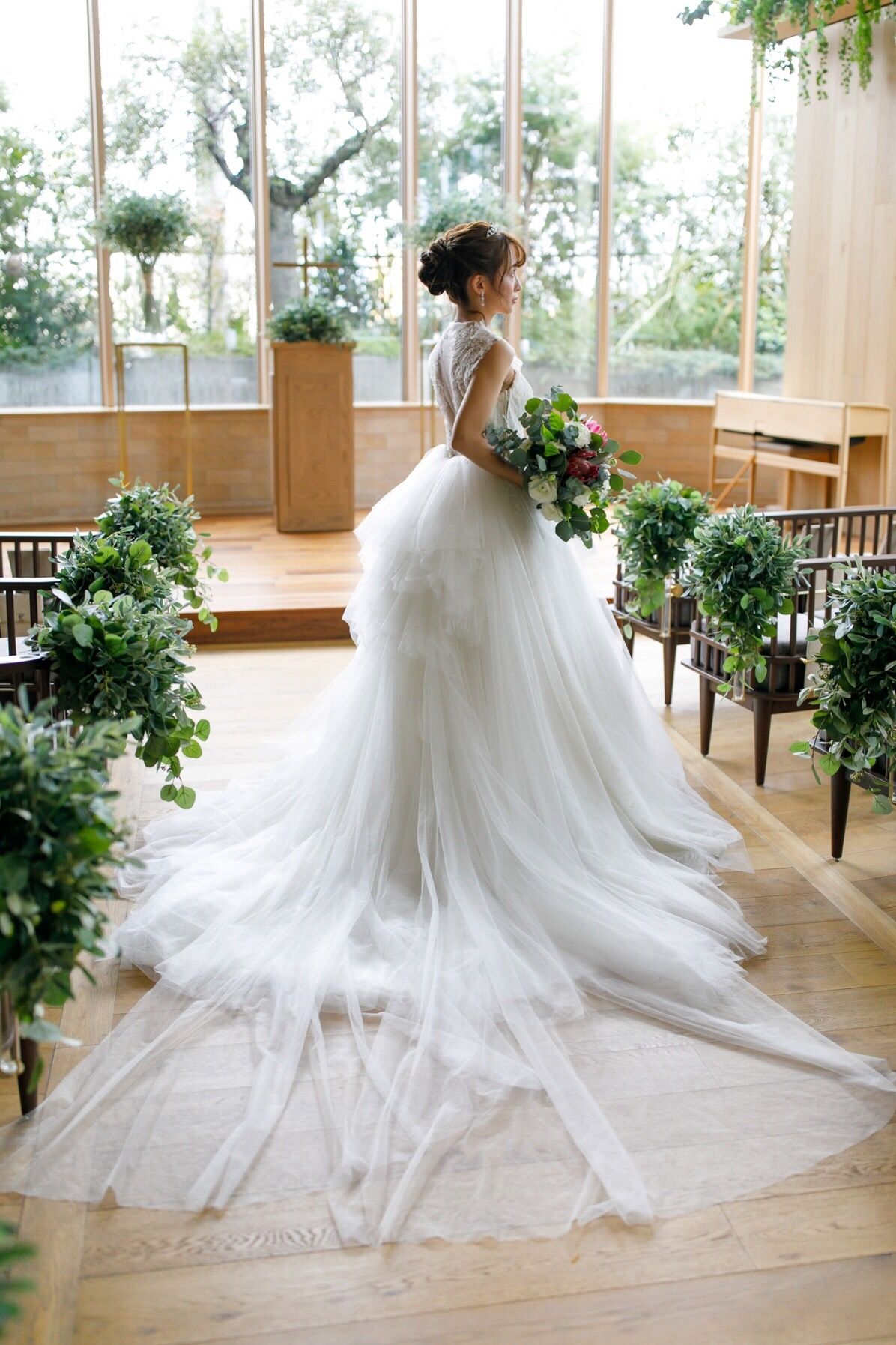 ウェディングドレス1着のみの予定だったので、王道のAラインで、中座前後で変化がつけられるもので探しました。