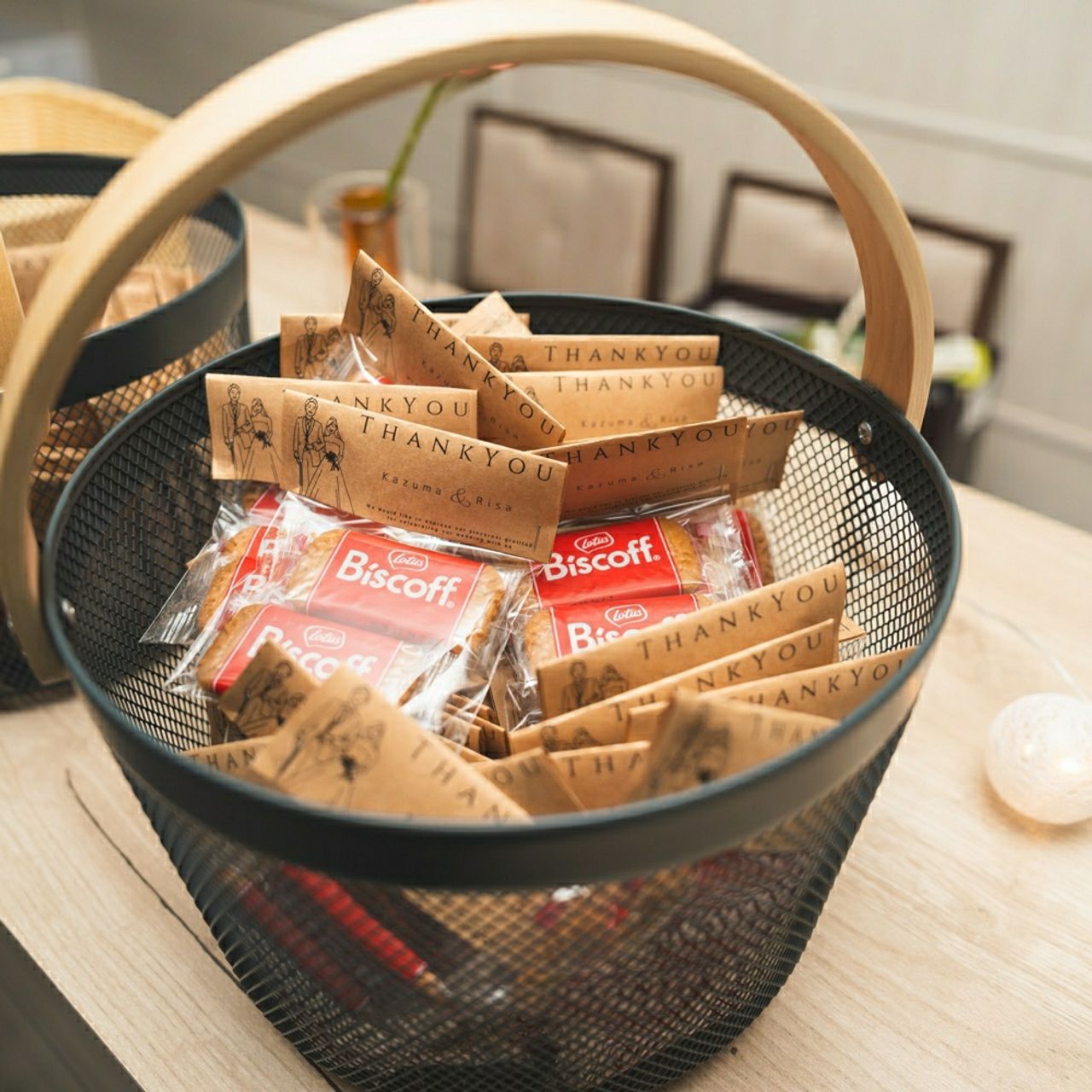 楽天で大量買いしたものを1人2袋ずつ個別で詰めて、手作りしたサンキューダグをつけました。