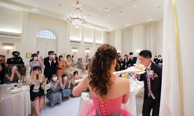 コンセプトは“66story”です。日付の6には“無限の愛”という意味があります。2人とも好きな「美女と野獣」の物語にも「愛」というテーマがあることから、隠れテーマにしました。この美女と野獣の雰囲気を味わってもらうために、物語に出てくる野獣の城の門をウェルカムスペースに設置したり、お馴染みのバラはメインテーブルに飾りました。