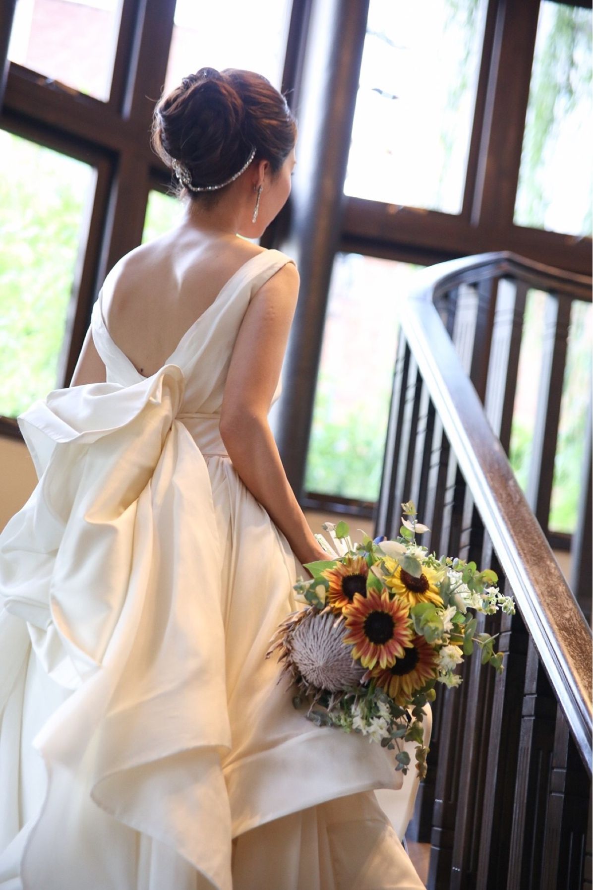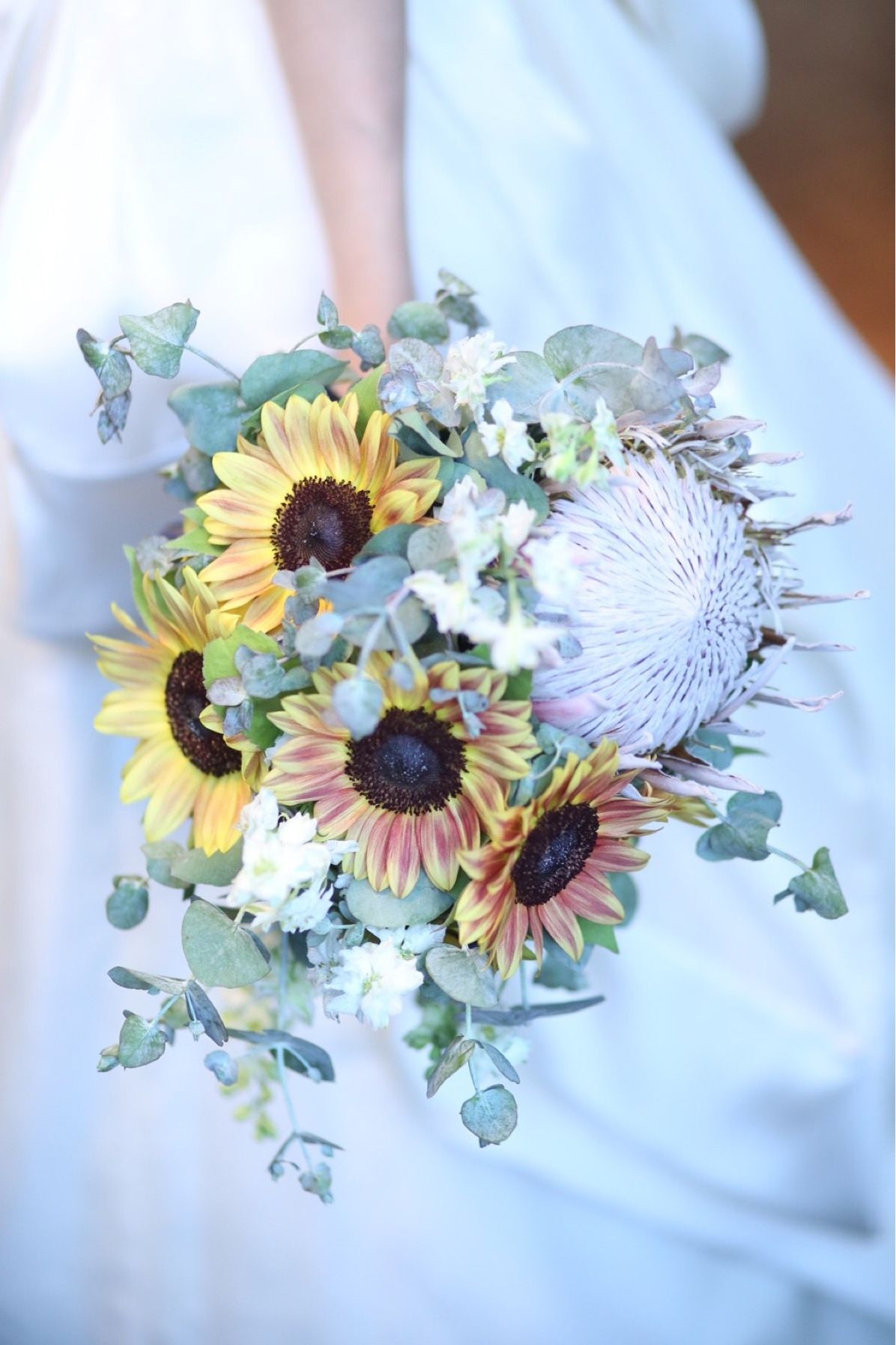 ブーケでは、季節感を出したかったのでアンティーク調の深みのあるひまわりと、キングプロテアを使用して頂きました。 茶色が入っているひまわりが、ゲストの目を惹きました
