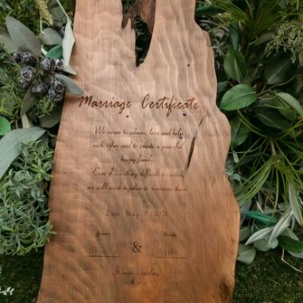 この言葉は、“笑顔を絶やさない”という意味で、結婚証明書にも彫刻しました。そして、テーマ通り当日はみんなとたくさん笑顔で過ごすことができました。