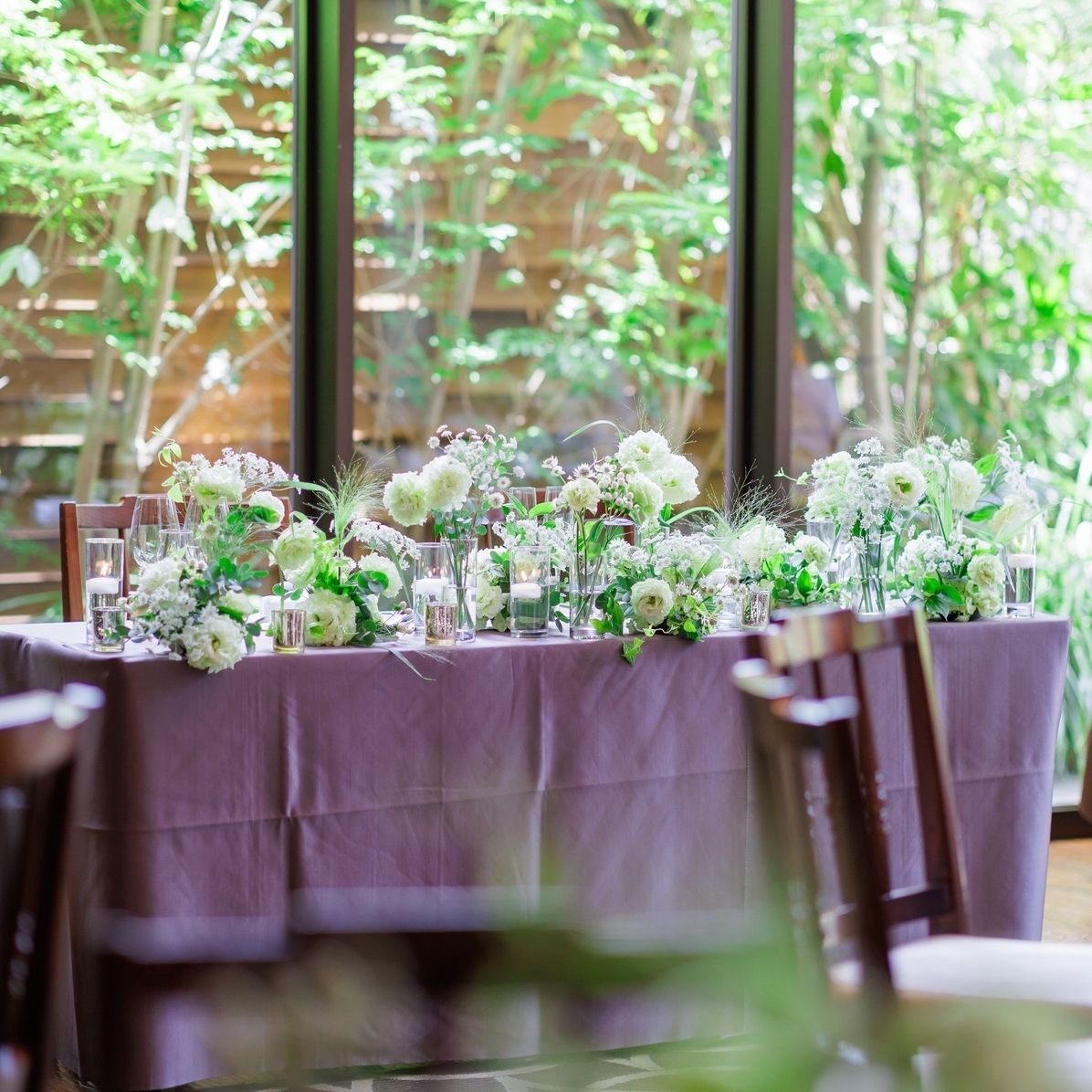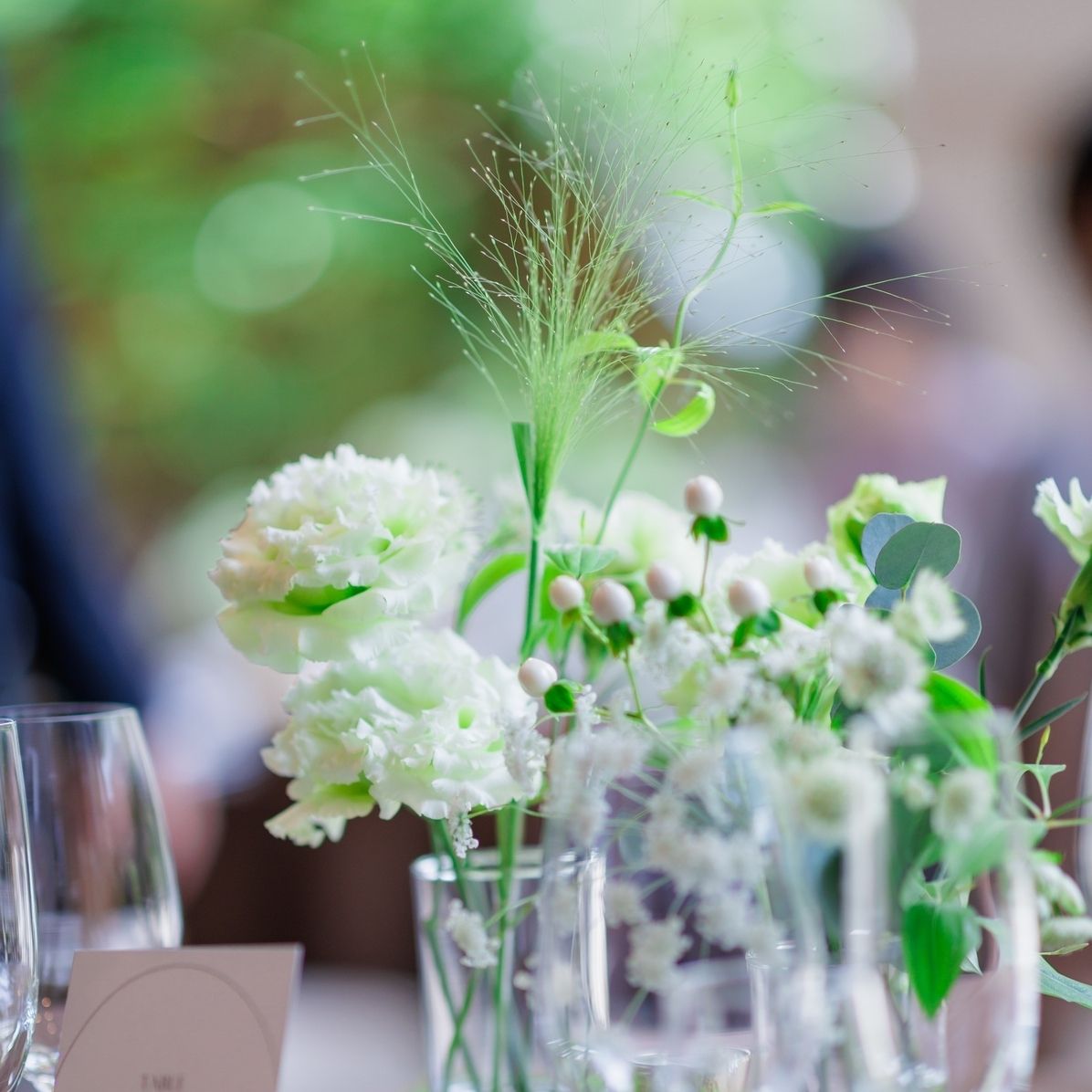 全体的にホワイトグリーンの色味にし、ゲストテーブルの装花は向かいのゲスト同士も会話しやすいよう低めにしていただいています。