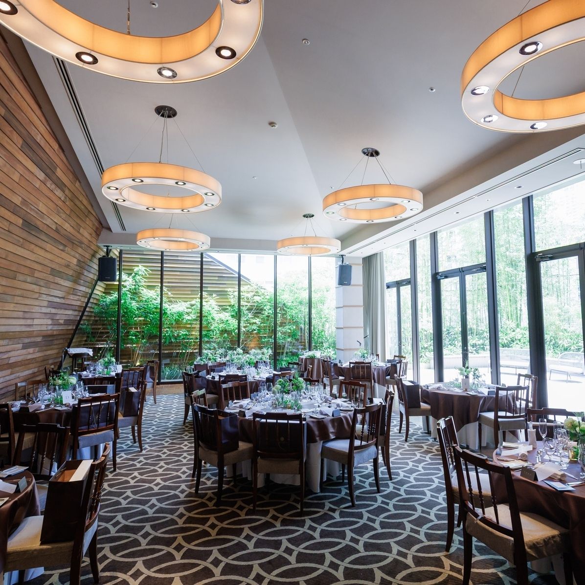 高砂の後ろの窓越しに植物が見えるため、新郎新婦の背景がどの角度からも素敵に見えます。また、高砂席の装花もグリーンにしたので、とても豪華な装花に見えました。