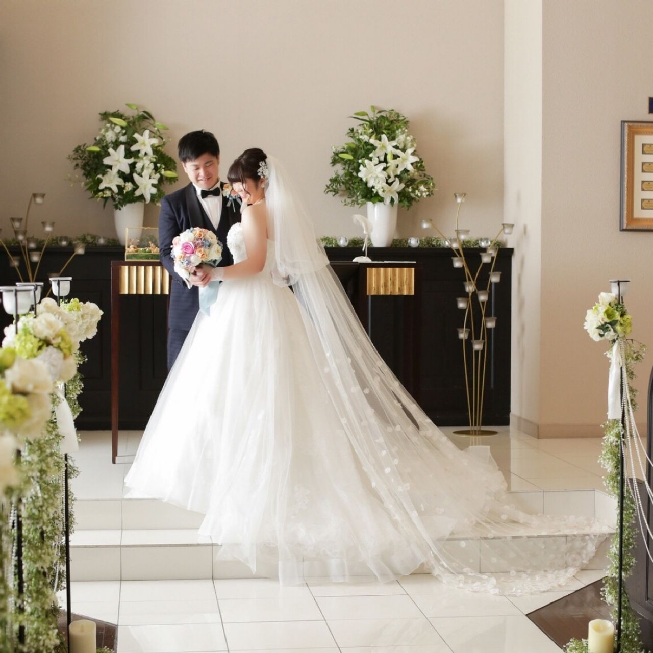 白のウェディングドレスを着用しました。