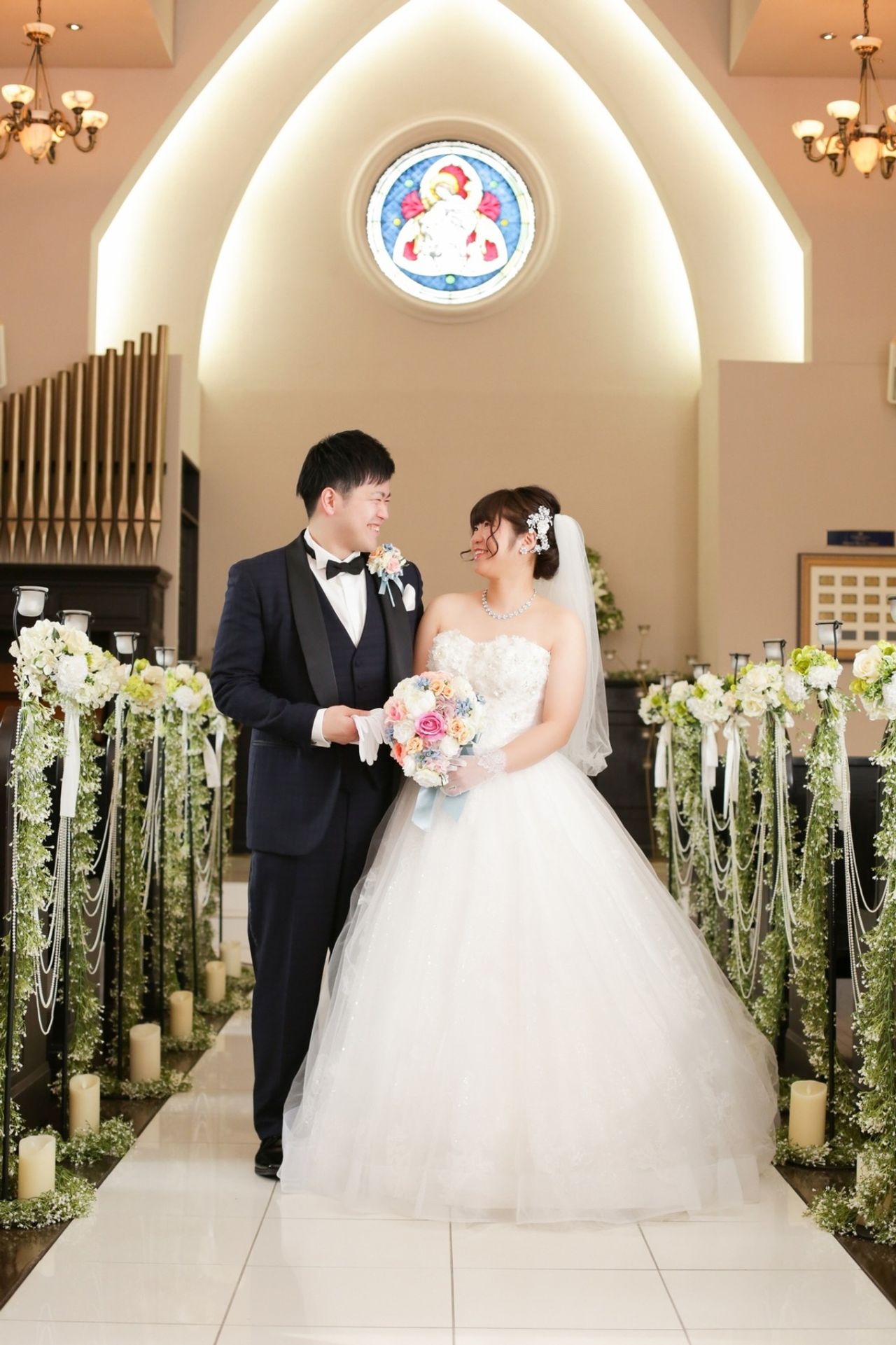 バージンロードのまわりのロウソクの光が暖かい雰囲気を演出してくれました。