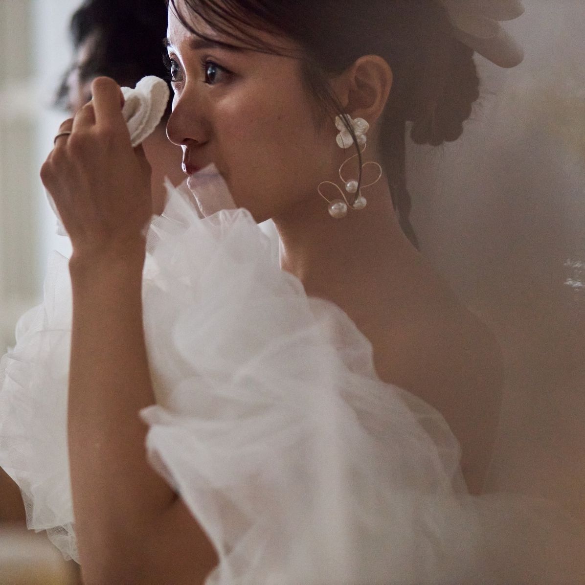 披露宴ではお色直しをしない分、アクセサリーでイメージチェンジしたくて、カジュアルな感じにしました。披露宴ではドレスにオフショルダーをつけたので、ネックレスはつけず、ピアスで存在感を出しています!