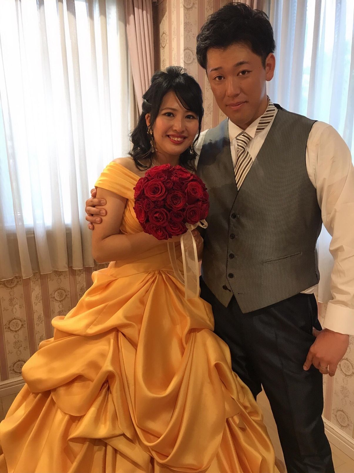 ベルの衣装に合わせて、ブーケやブートニアをバラの花束にしました。