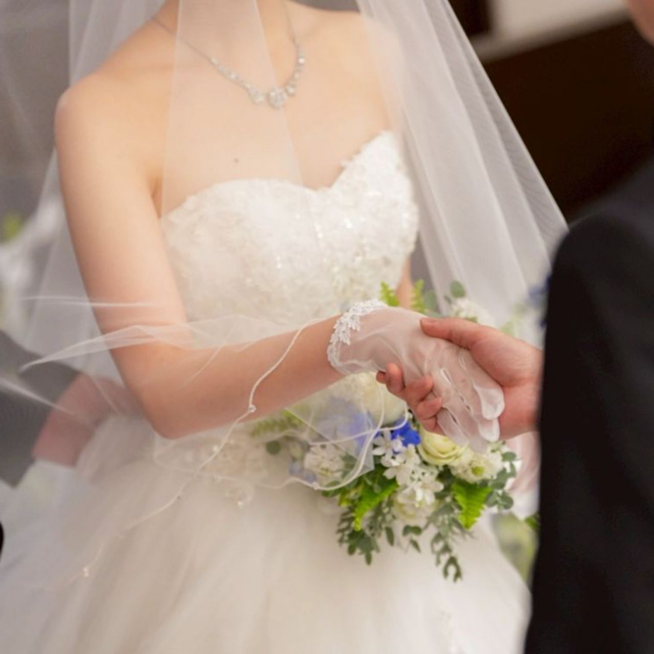アクセサリーは、王道のティアラではなく、花が連なったデザインのティアラを選びました。ネックレスもティアラと似たデザインのものを合わせて、全体に統一感を持たせています。