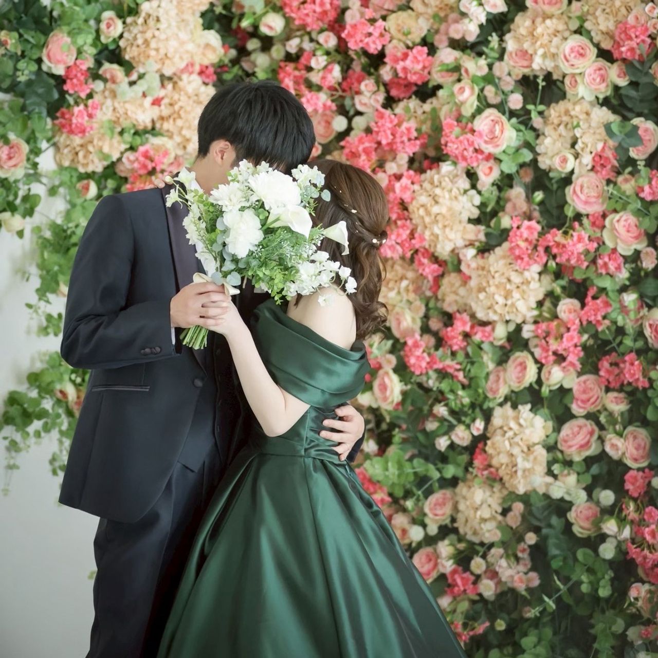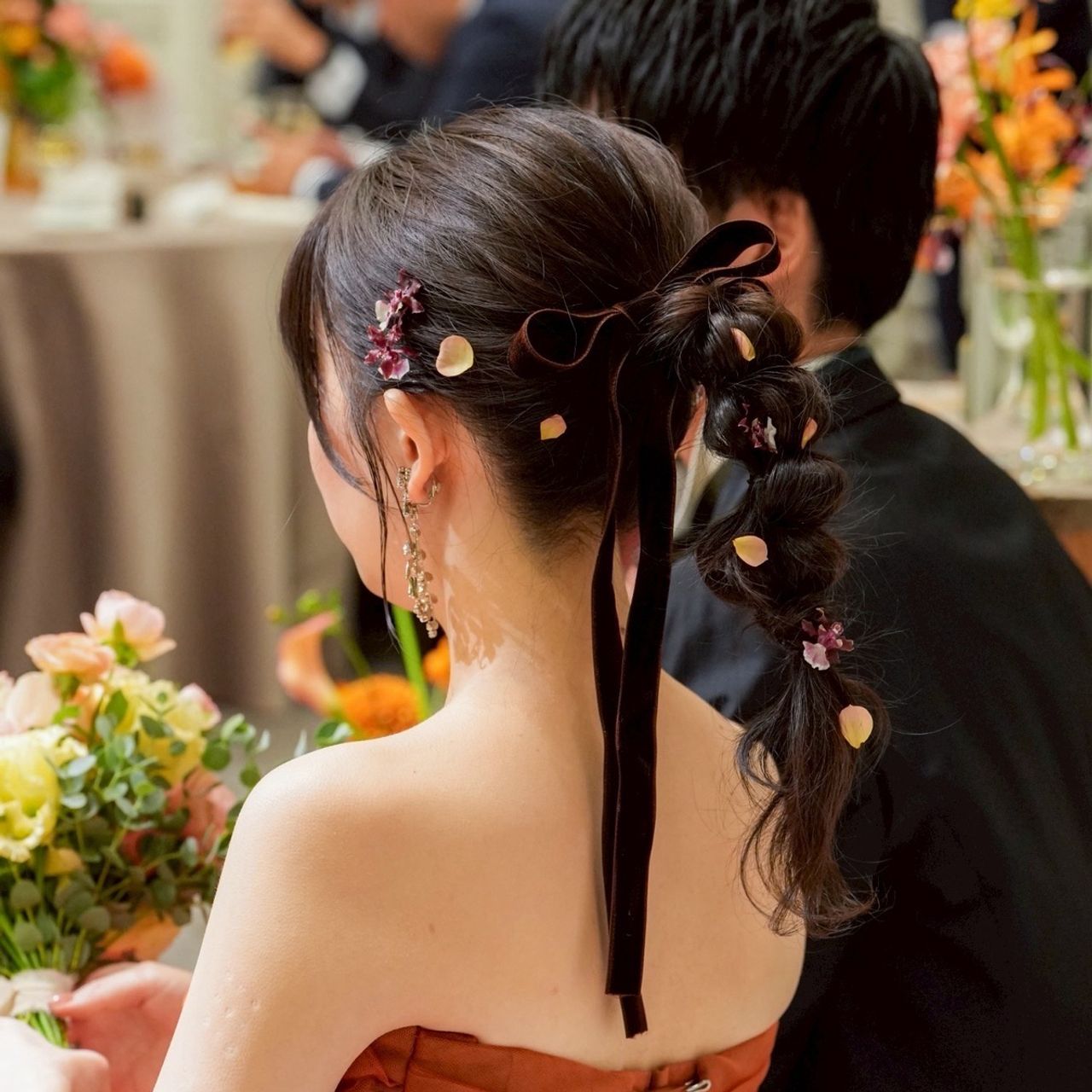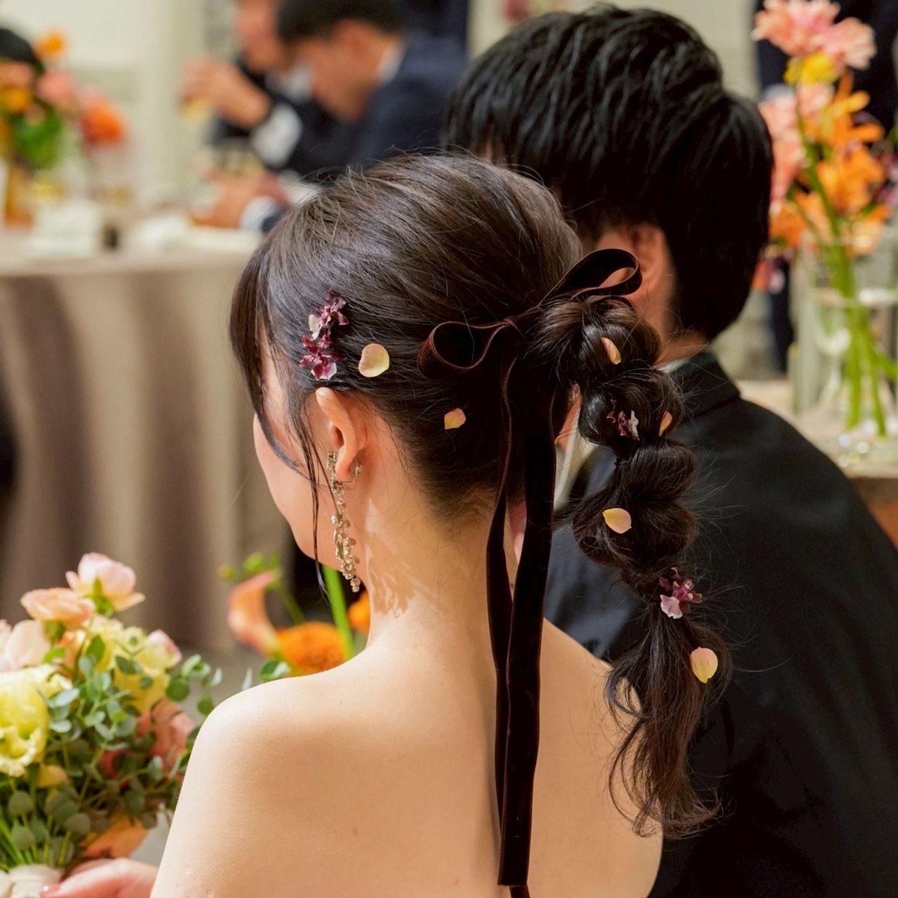 ヘアメイクのポイントは、生花を取り入れたことです。