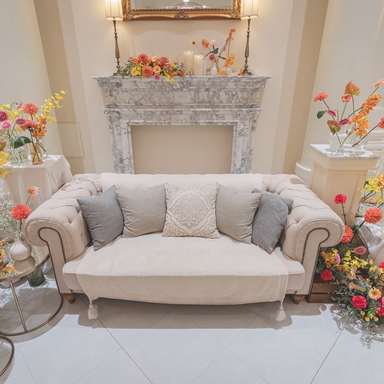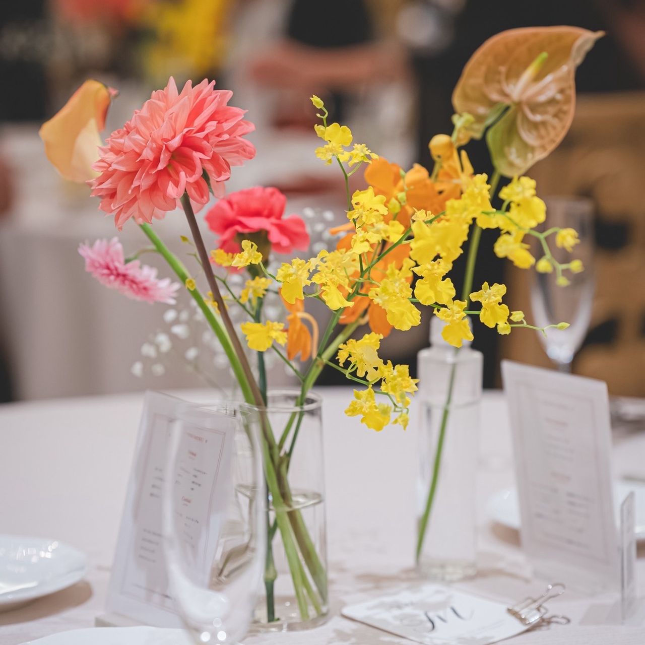 会場が白を基調としていたこともあり、ビタミンカラーを取り入れて華やかにしてもらいました。お花はまとまった束ではなく、1輪ずついくつかに分けて飾ることで、オシャレで可愛らしい雰囲気に仕上がったと思います。