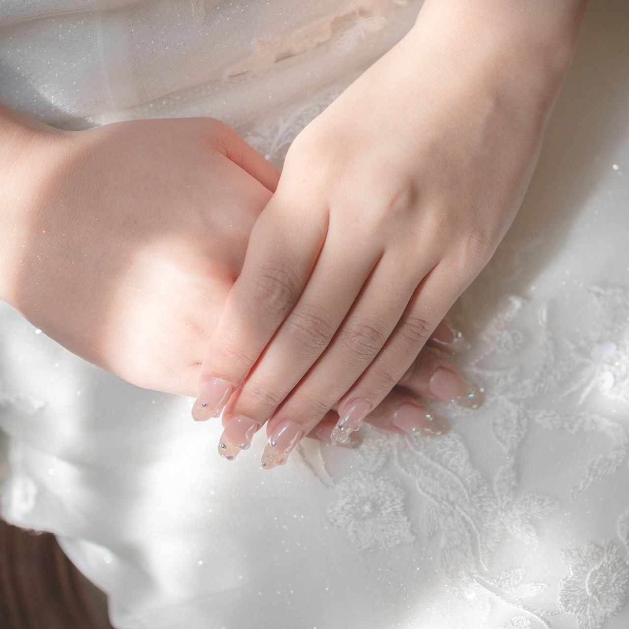 サプライズでドレスの色当てもあったため、バレないように白をベースにキラキラをあしらってもらいました。パールもプラスして、ボディパールとさりげなくリンクさせているのがポイントです。