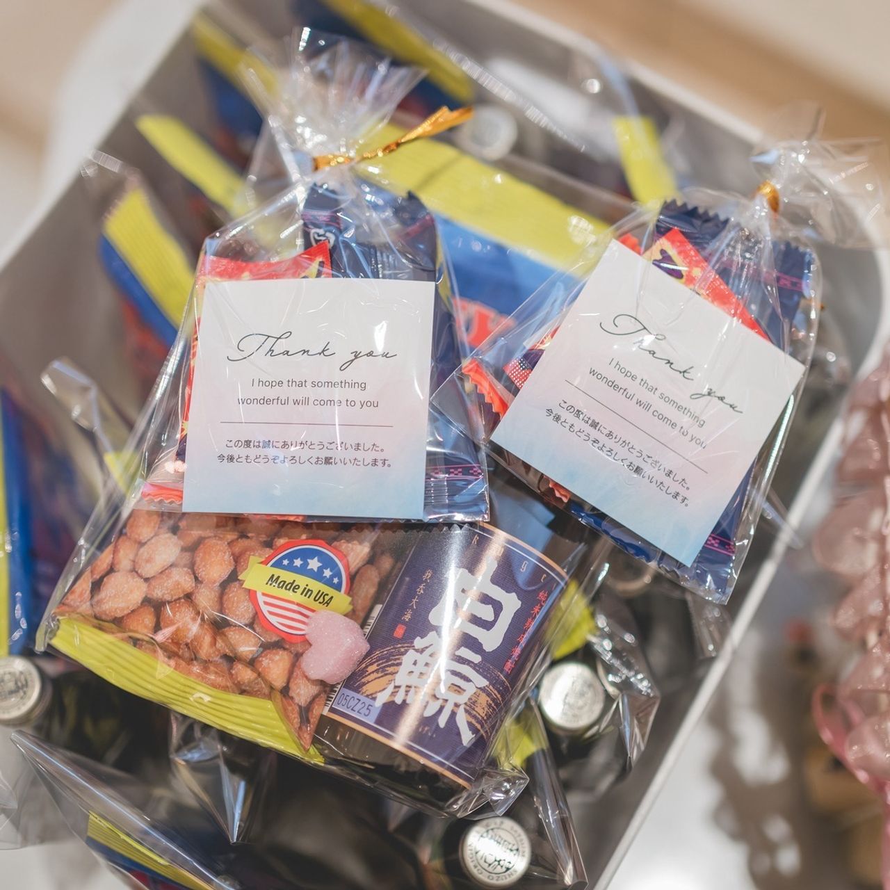 お見送りのギフトは、職場で沖縄に行くこともあったので、せっかくならと思い、沖縄名物のちんすこうと黒糖チョコを自分で袋詰めして渡しました。
