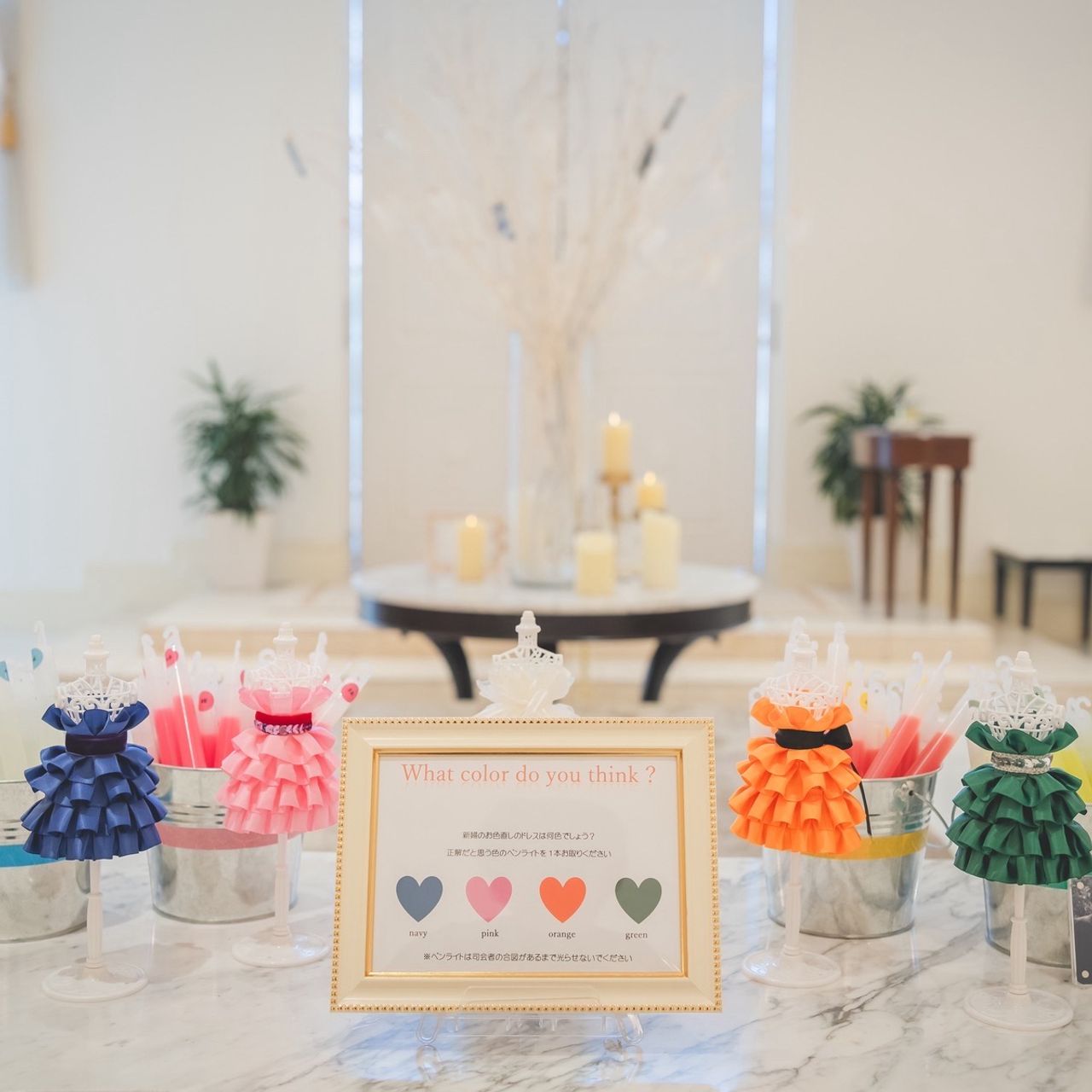 ドレス色当て用のミニドレスを作ったり、前撮りで着た自作の衣装を飾ったり、カラードレスはサプライズ演出にしたりしました。