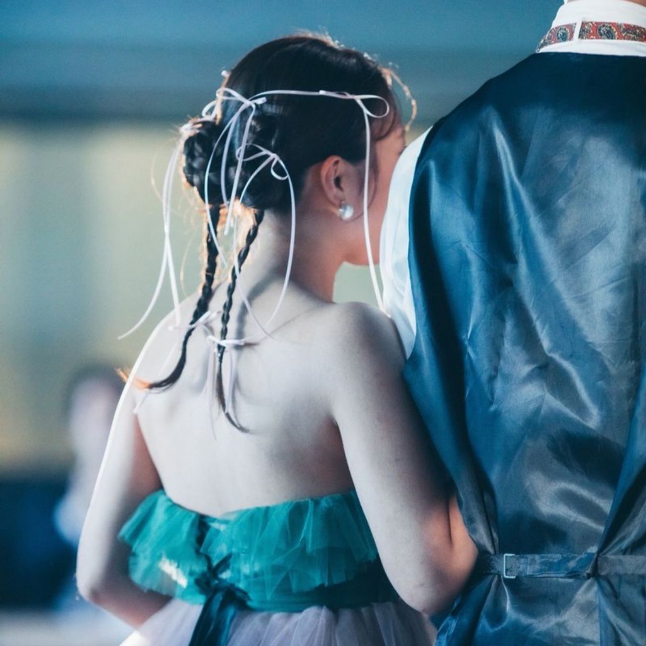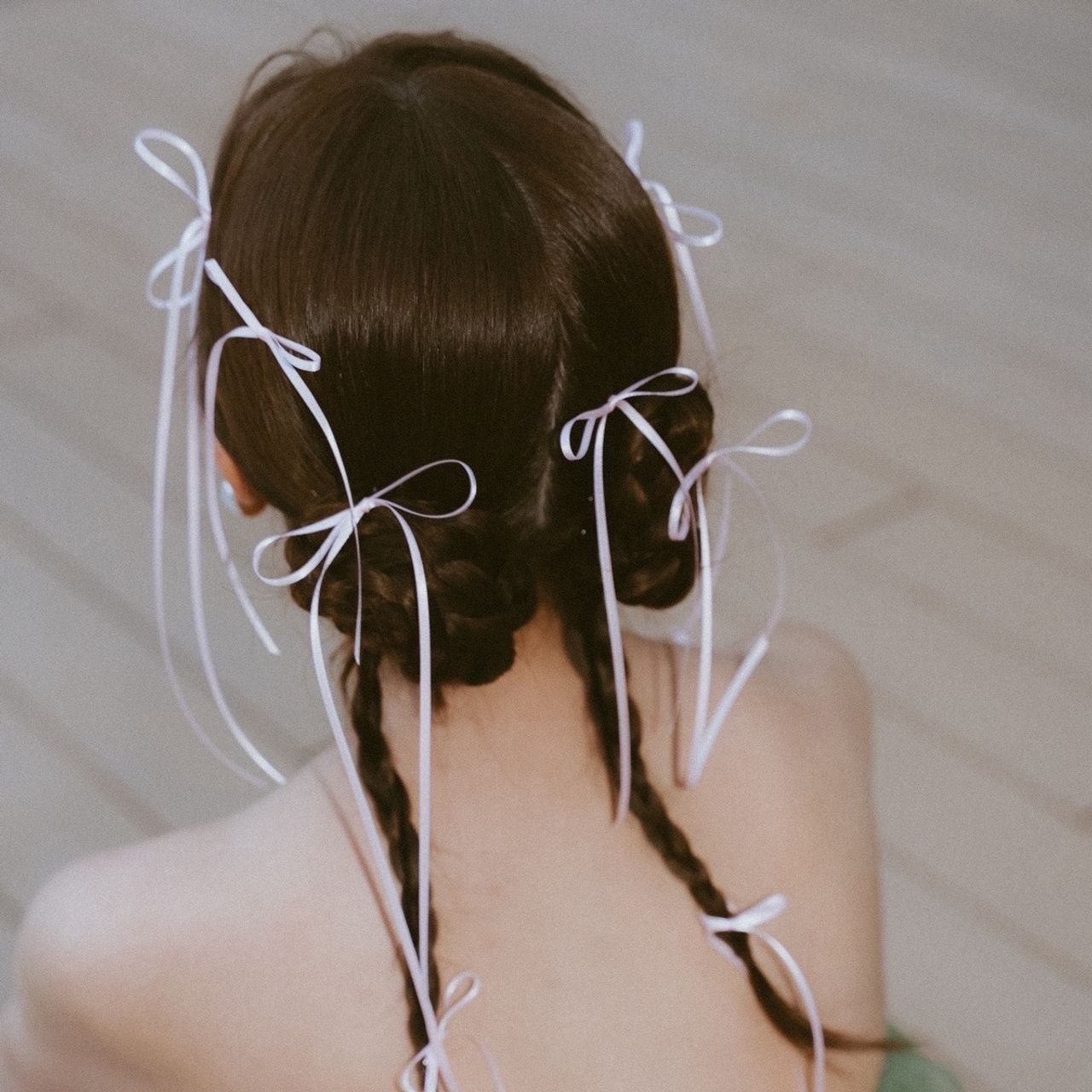 ウェディングドレスの時はストーンをつけて、カラードレスの時はリボンをたくさんあしらっています。