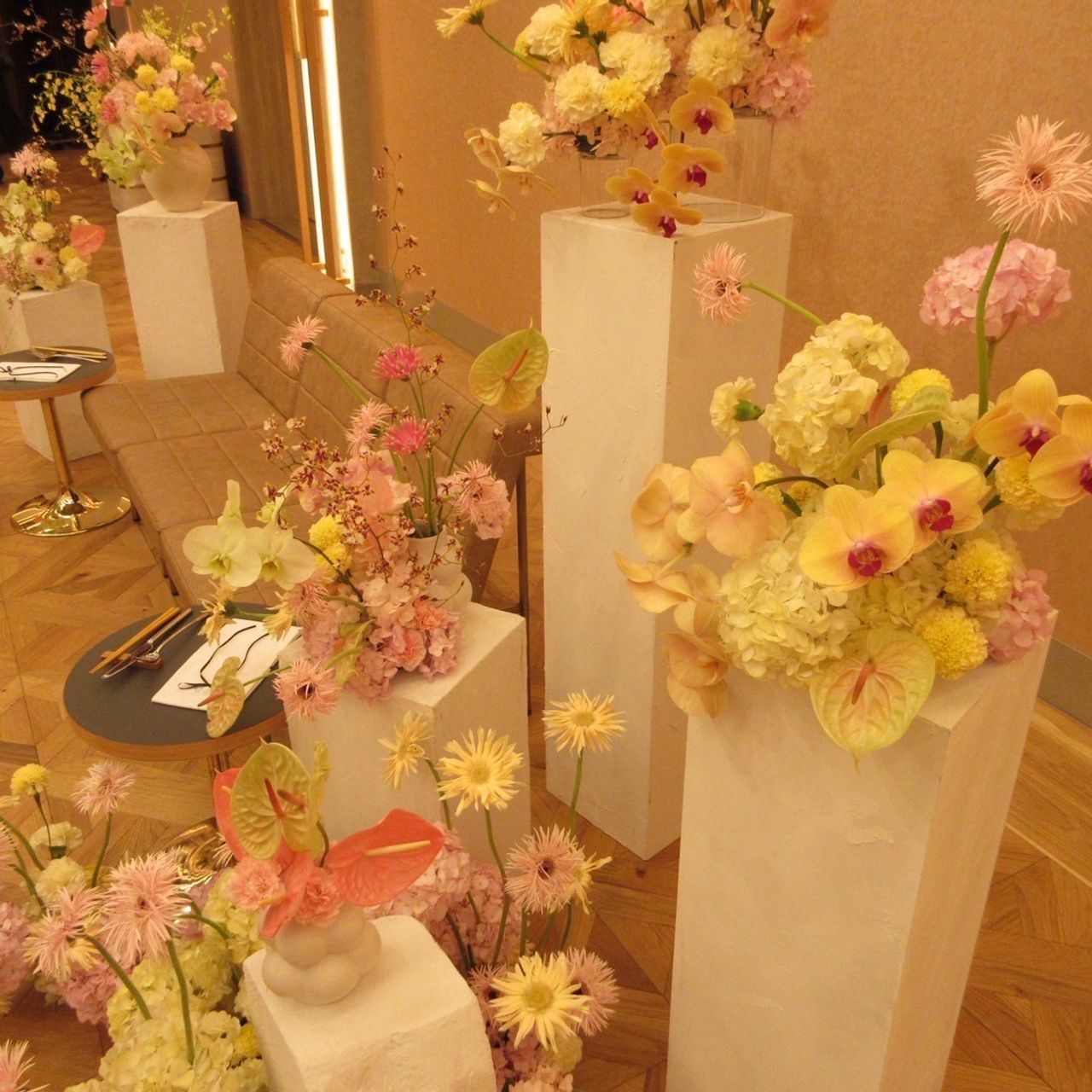 装花は夏らしく、明るく優しい雰囲気になるようお願いし、会場全体にお花をちりばめてもらっています。