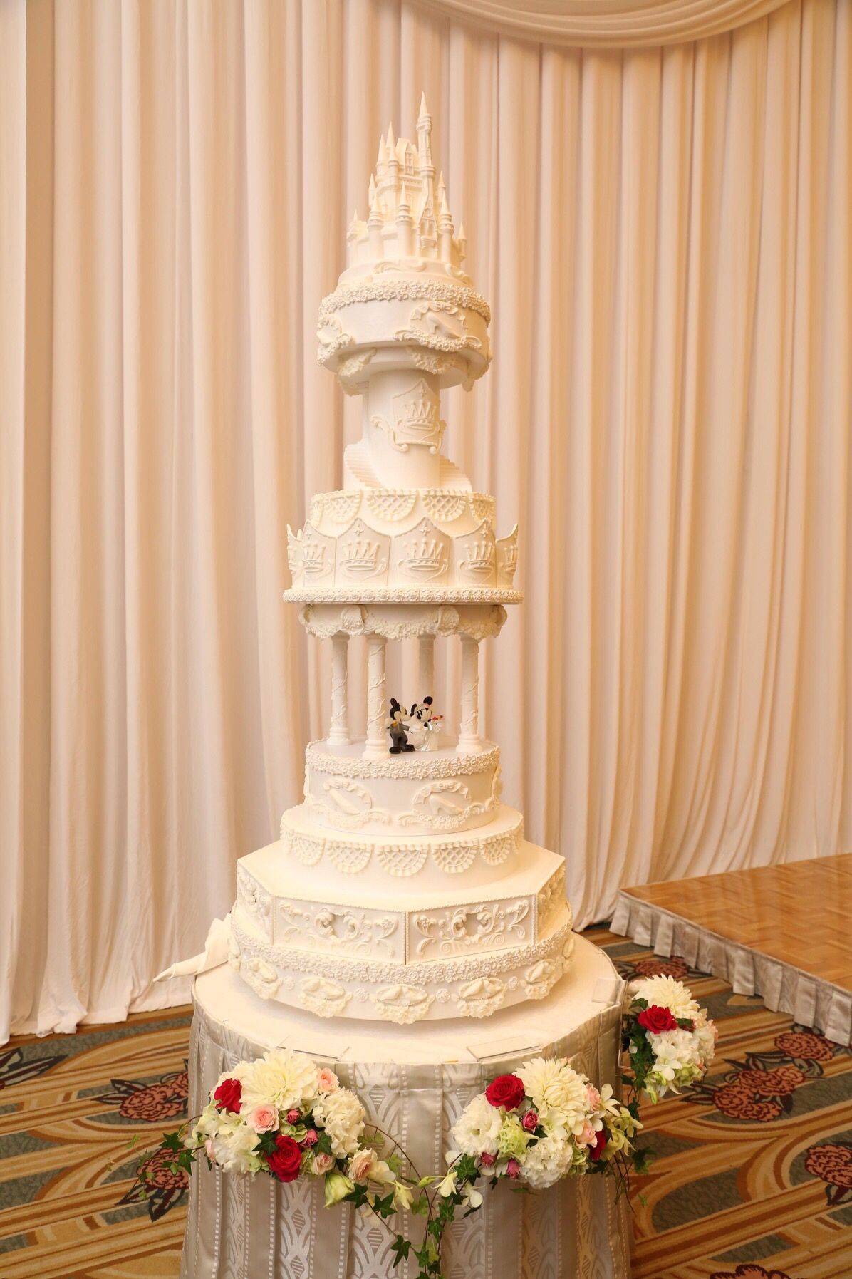 シンデレラ城のかなり大きいフェイクケーキにしました。 真ん中にはドレスを着用したミッキーとミニーの陶器があります。