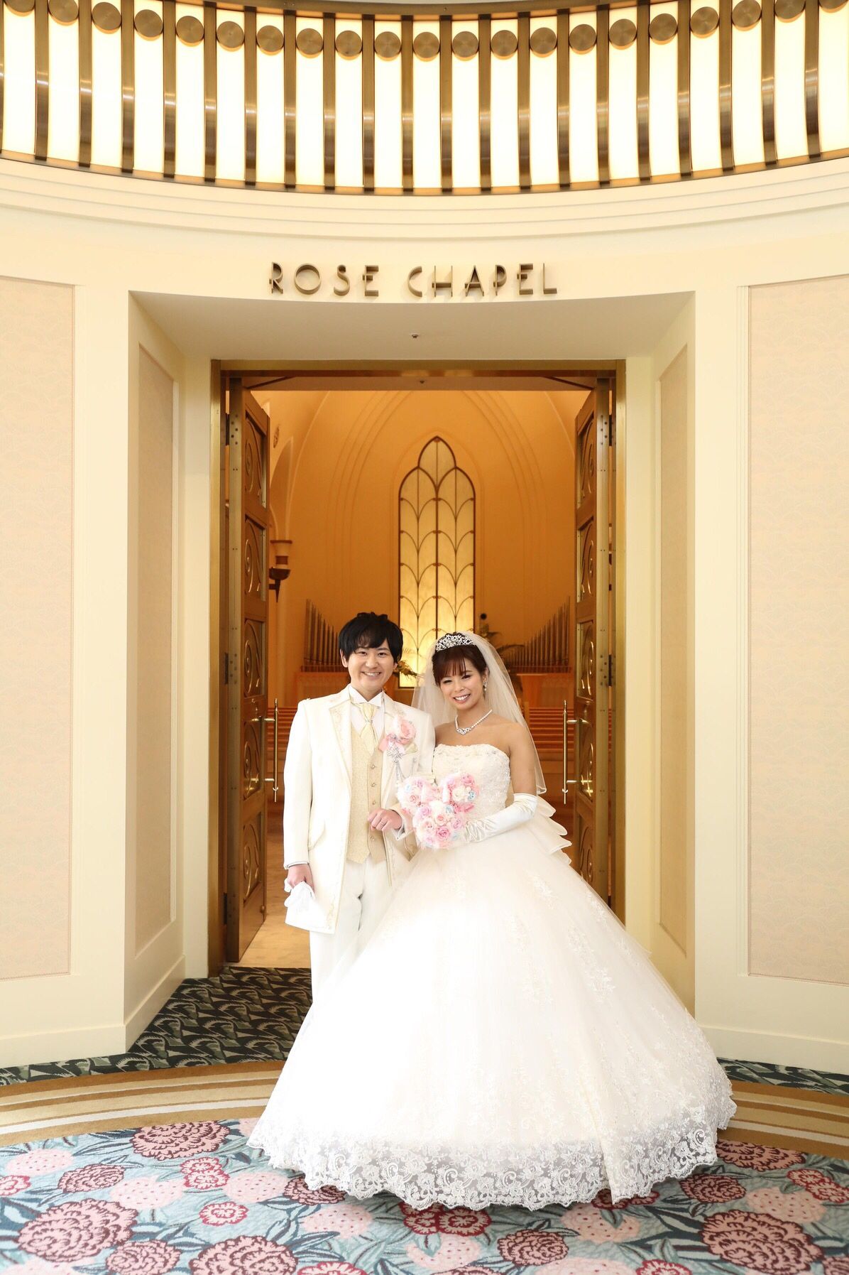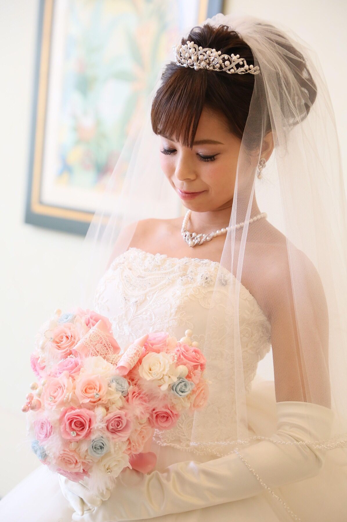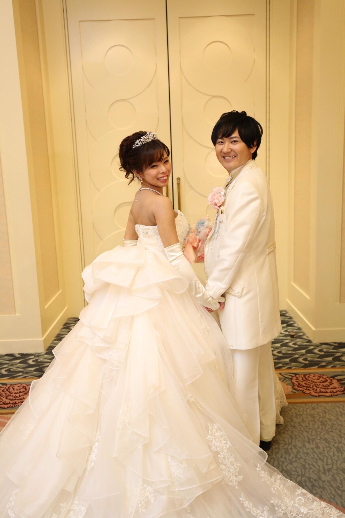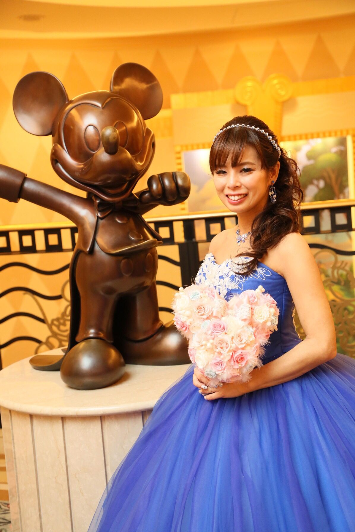 挙式はアンバサダーホテルオリジナルのミキモトのミッキーティアラ、ミッキーのイヤリング、ミッキーのネックレスを、使用しました。